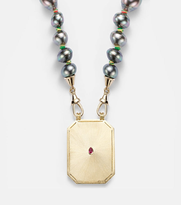 Handcrafted in 18kt yellow gold with 3 pear-shaped rubies totaling 0.16ct and 1 round pearl; pendant 38 mm (1.5") length, 25 mm (1") width; adjustable chain up to 52 cm (20.5"); min width 1 mm (0.05"). Made in Italy.
