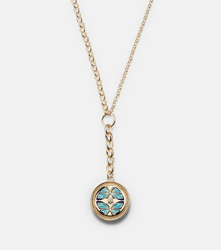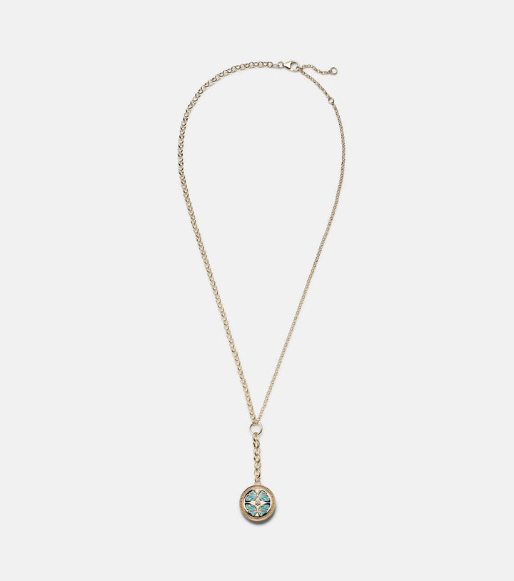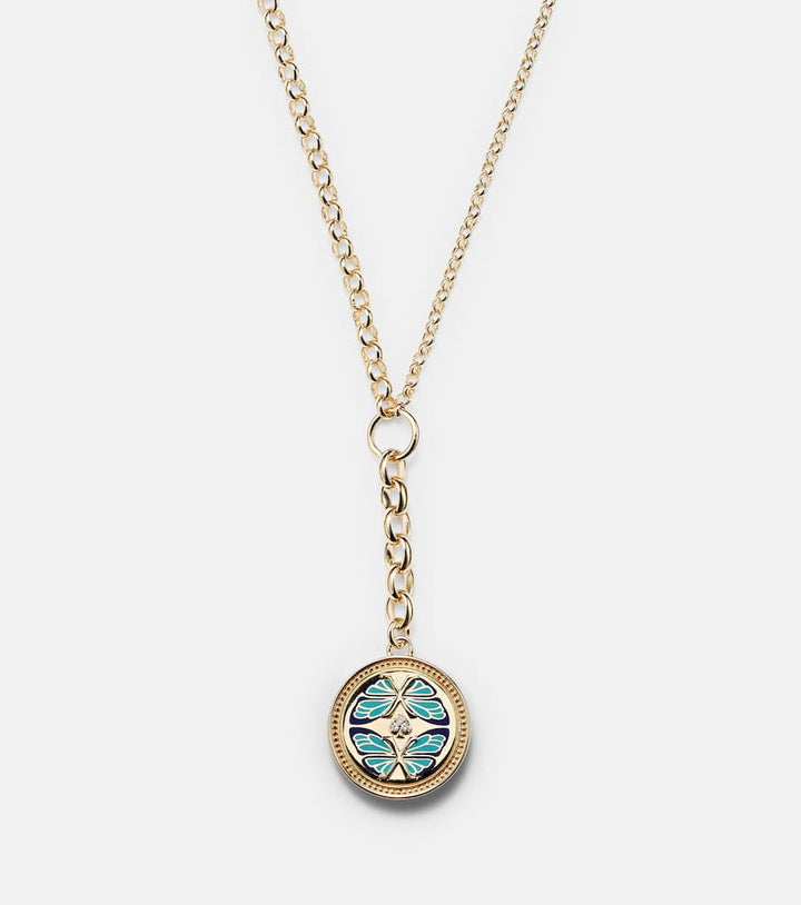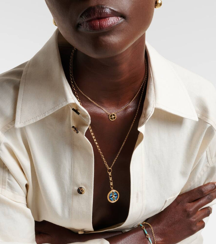 Handcrafted in 18kt yellow gold with round-cut pavé diamonds totaling 0.0503ct. Pendant 61 mm (2.4") length, 21 mm (0.85") width; chain width 2–3 mm (0.1"); adjustable 46.5–51.5 cm (18.5–20.5"). Made in the USA.