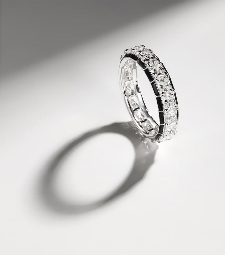This Kamyen Radiant Eternity Pinky Ring in 18kt White Gold features VS1 clarity diamonds totaling 8.52ct in a prong setting. Max width 5mm, available sizes US 3–8, the ring embodies contemporary elegance, precision craftsmanship, and wearable luxury. Ideal for stacking or solo styling, it delivers bold sparkle and refined architectural sophistication for high-end jewelry collections.