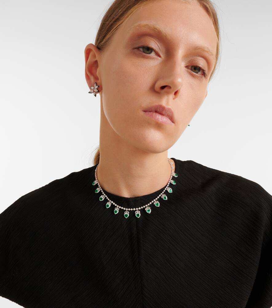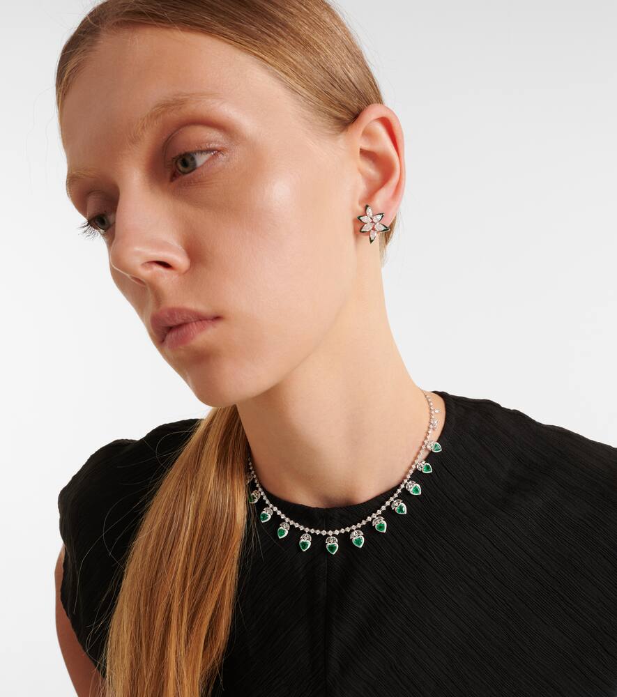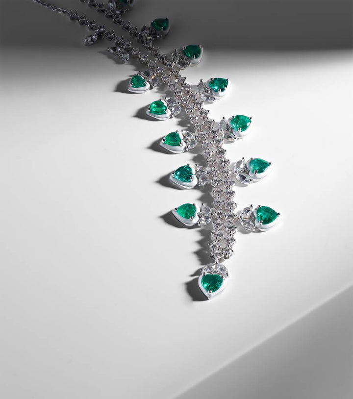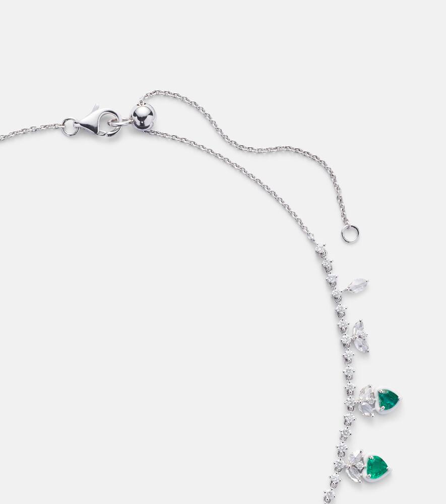 Handcrafted in 18kt white gold with enamel, featuring heart-shaped emeralds totaling 4.45ct and round/marquise-cut diamonds totaling 5.07ctw. Adjustable length: 30.5–41.5cm (12–16.5"). Maximum width 20mm (0.8"). Lobster-clasp fastening.