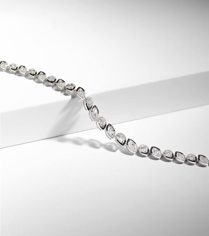 Handcrafted in 18kt white gold with enamel, set with pear, marquise, and round-cut diamonds totaling 7.84ctw. Adjustable length: 28.5–40.4cm (11–16"). Maximum width 12mm (0.5").