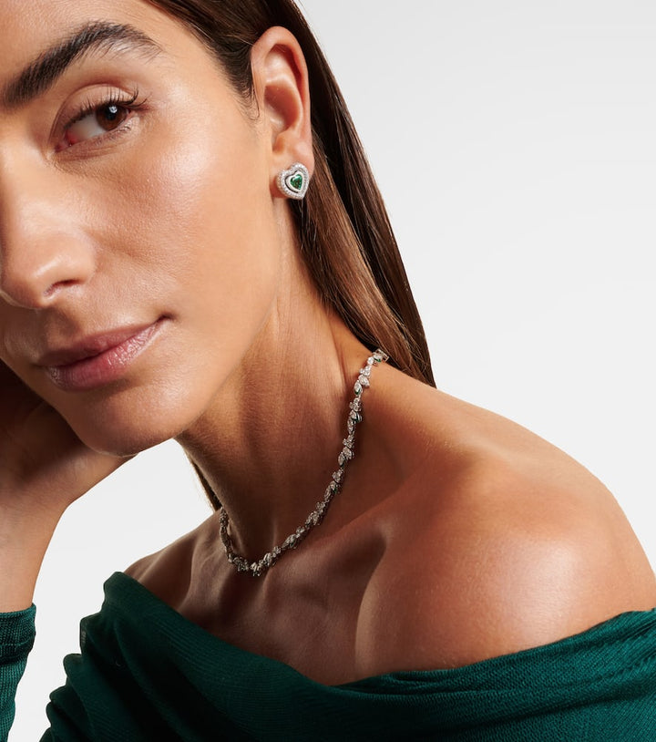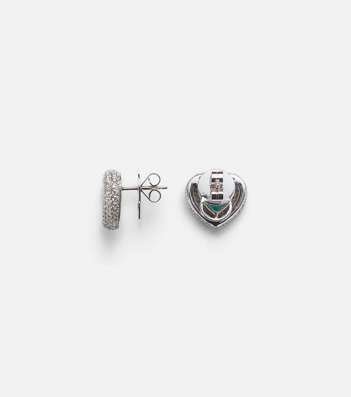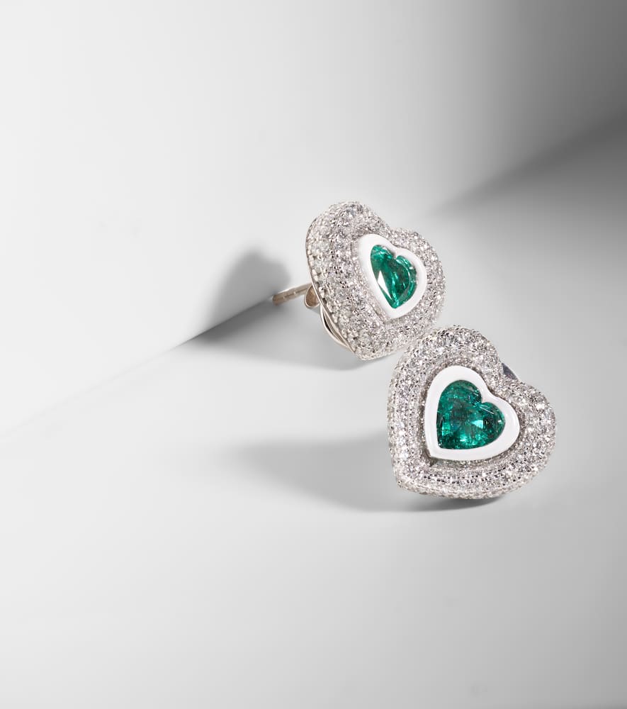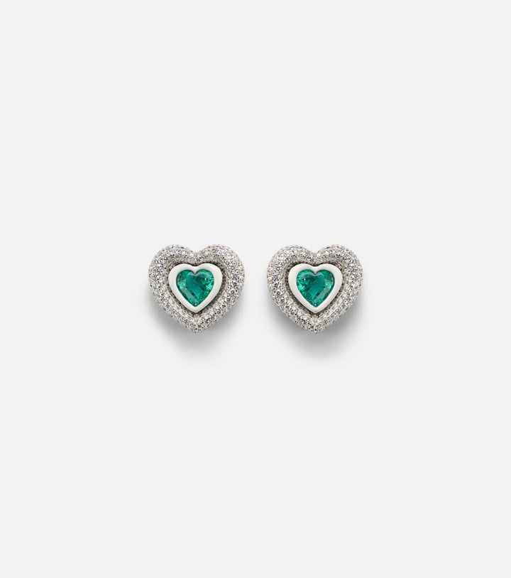 Heart 18kt white gold and enamel earrings with diamonds and emeralds