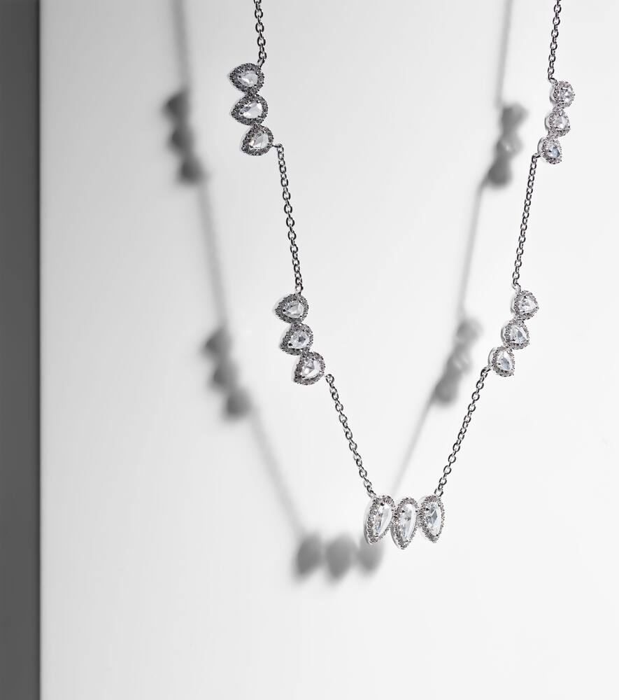 Handcrafted in 18kt white gold with marquise and round-cut diamonds totaling 5.09ctw, prong settings. Adjustable length: 33–46cm (13–18"); Pendant length 8mm (0.3"); Pendant width 20mm (0.8"); Width 1mm (0.05").