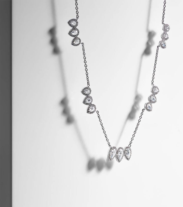 This Kanika 18kt White Gold Necklace by Kamyen is a testament to luminous craftsmanship, featuring marquise and round-cut diamonds totaling 5.09ctw. The adjustable chain allows versatile wear, while the elongated pendant accentuates elegance and sophistication. Designed for layering or as a singular statement piece, it embodies refined luxury and meticulous attention to detail. Kamyen’s artistry ensures each diamond is optimally placed for brilliance, creating a piece that symbolizes elegance, strength, and enduring beauty.