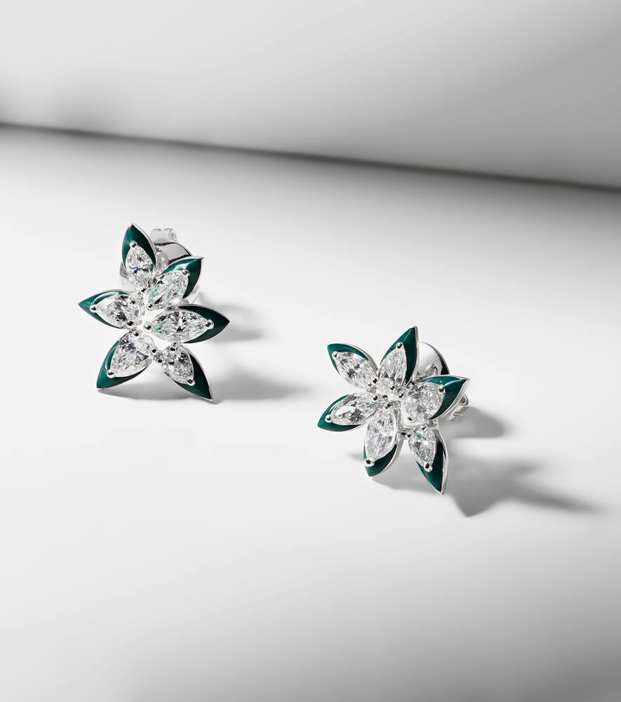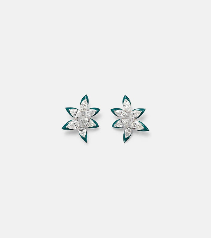 Handcrafted in 18kt white gold with 2.74ct marquise- and pear-shaped diamonds, prong settings, green enamel accents. Length 19mm (0.75"); Max width 14mm (0.55").