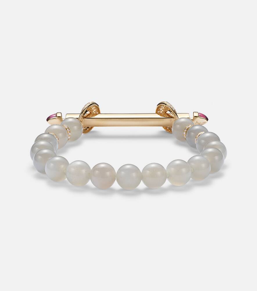 Handcrafted in 18kt yellow gold with 186 round-cut diamonds (1.25ctw, pavé setting, VVS-VS, G-J), 21 moonstones, 2 rubies. Max width 11mm (0.45"); Circumference 15cm (6"); Elasticated band.