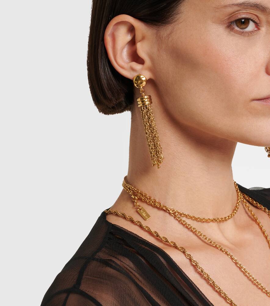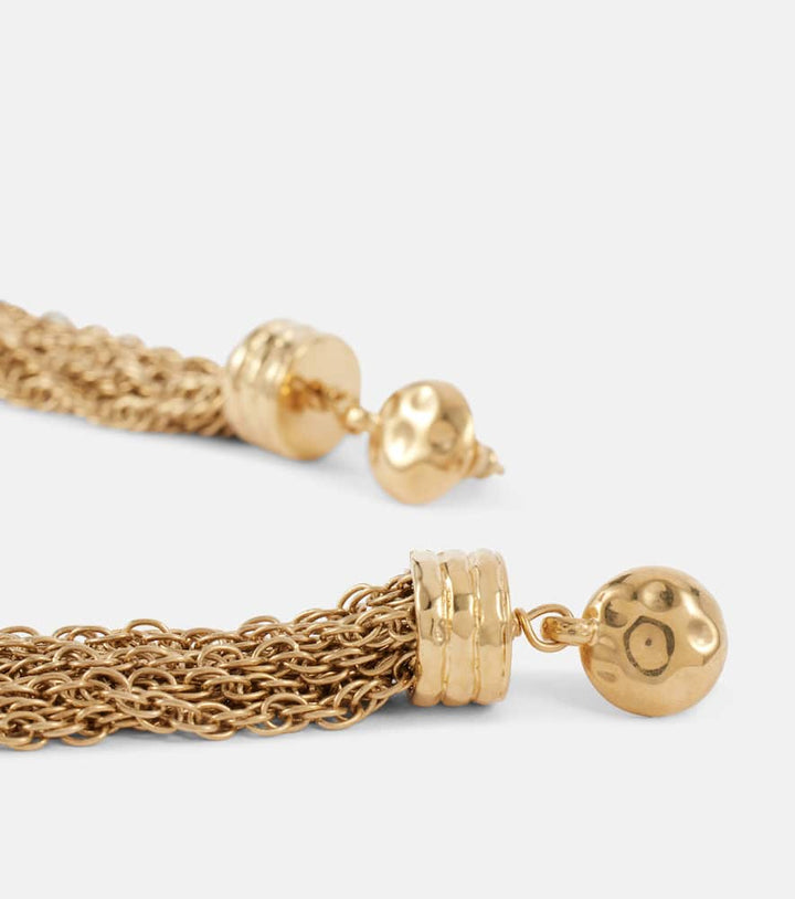 These Chloé Pompoms drop earrings are a stunning example of bold, modern design with a touch of playful elegance. Crafted in Italy from polished brass, the earrings feature a delicate chain that elegantly suspends a series of whimsical "pompom" charms. The pin fastening ensures a secure fit for pierced ears. These earrings are designed to add movement and sophisticated drama to any look, making them a perfect statement piece for special occasions.