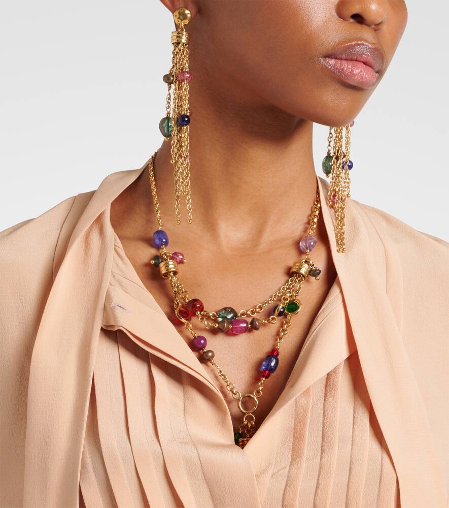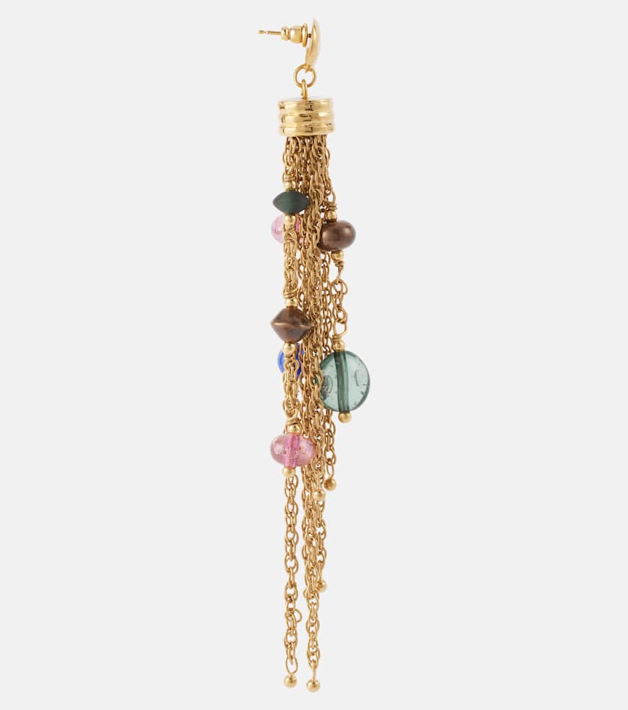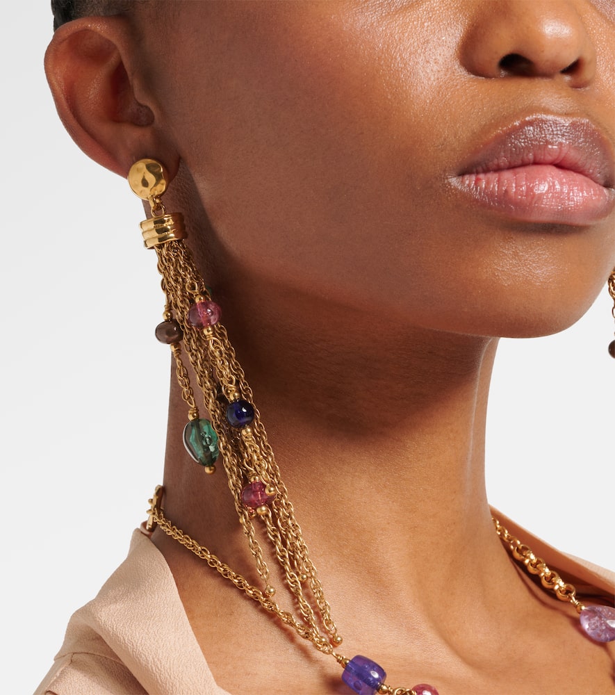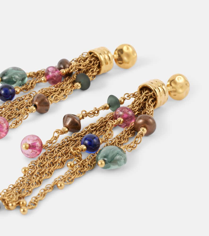 These Chloé Pompoms embellished drop earrings are a captivating blend of bohemian and modern style. Crafted in Italy from polished brass, the earrings feature a long, elegant drop design with a unique faux shell embellishment that adds a touch of natural charm. The pin fastening ensures a secure fit for pierced ears. These earrings are a perfect statement piece, designed to add fluid movement and a touch of sophisticated drama to any look, from casual to formal.