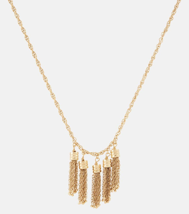 This Chloé Pompoms pendant necklace is a beautiful and whimsical piece that captures the essence of bohemian elegance. Crafted in Italy from vintage gold-toned brass, the necklace features a delicate chain adorned with a series of playful "pompom" charms. The adjustable length and secure lobster-clasp fastening make it a versatile piece perfect for layering. This necklace is an essential accessory for adding a touch of joyful sophistication and fluid movement to any look.