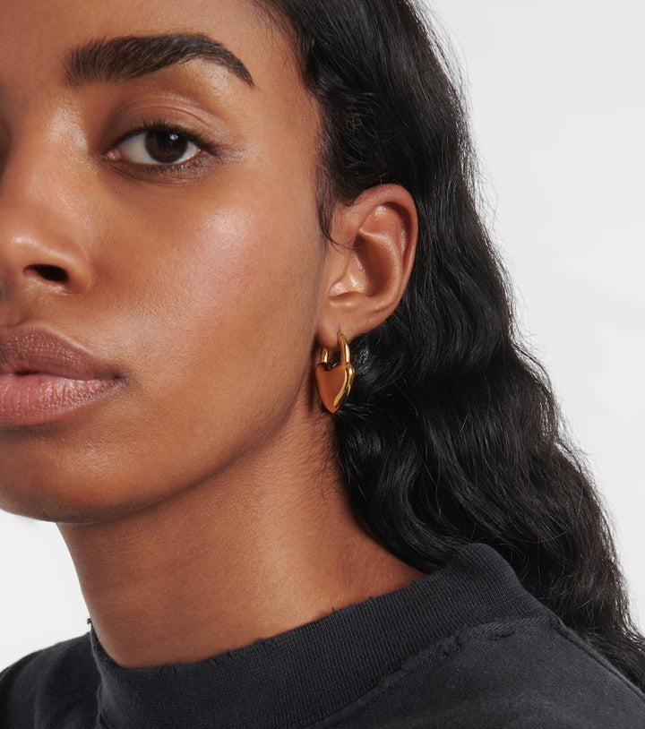 These Balenciaga Minnie earrings are a chic and minimalist accessory that exudes modern sophistication. The sleek, polished brass design features a subtle heart shape that adds a touch of playful elegance to an otherwise classic look. With their discreet buckle fastening, these earrings are perfect for everyday wear, offering a hint of Balenciaga’s edgy and refined style. They are a versatile piece that can seamlessly transition from day to night.