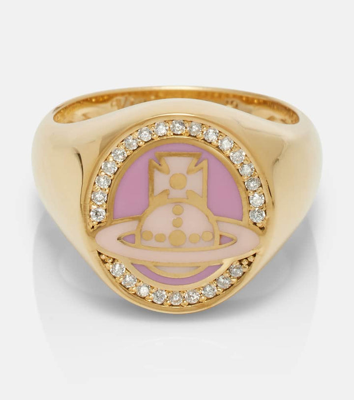 This Vivienne Westwood Embellished ring is a striking piece that captures the brand’s signature punk-infused, rebellious spirit. Crafted from polished 925 sterling silver, the ring is adorned with a beautiful gold and purple embellishment. This bold accessory is designed to make a statement, perfect for those who appreciate unique and edgy jewelry. It can be worn to add a touch of unapologetic style and luxury to your everyday look.