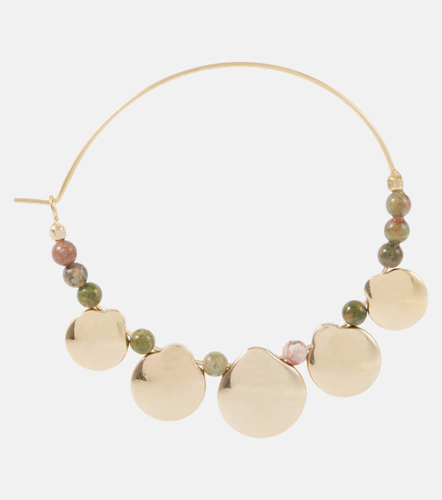 These Isabel Marant Adriel beaded hoop earrings are a vibrant and bohemian accessory. Crafted in Poland from a combination of brass and stone, these earrings feature a classic hoop design adorned with a striking beaded detail in a vibrant green color. The elegant hook fastening ensures a secure fit for pierced ears. These earrings are a perfect statement piece to add a pop of color and an artisanal touch to your look, whether for a festival or a casual outing.