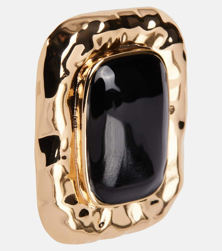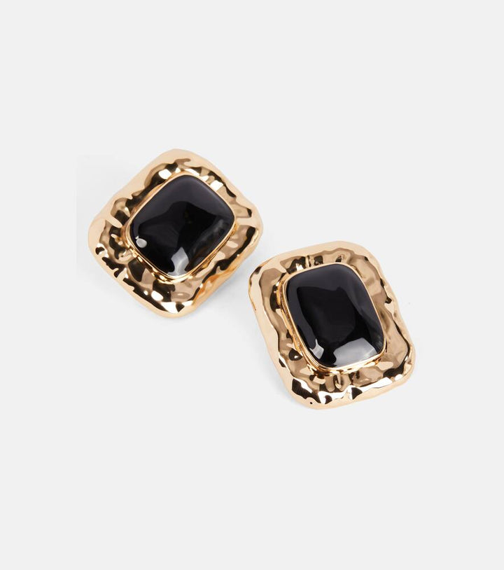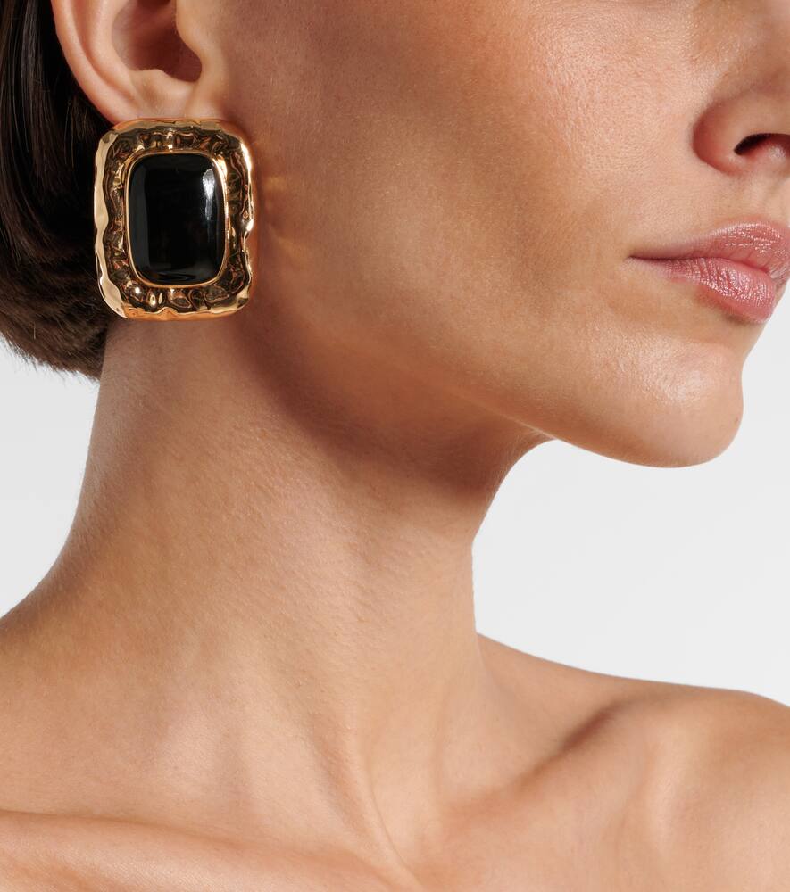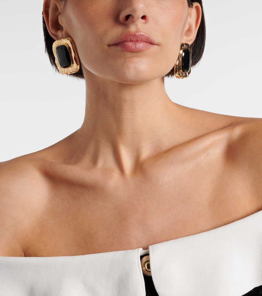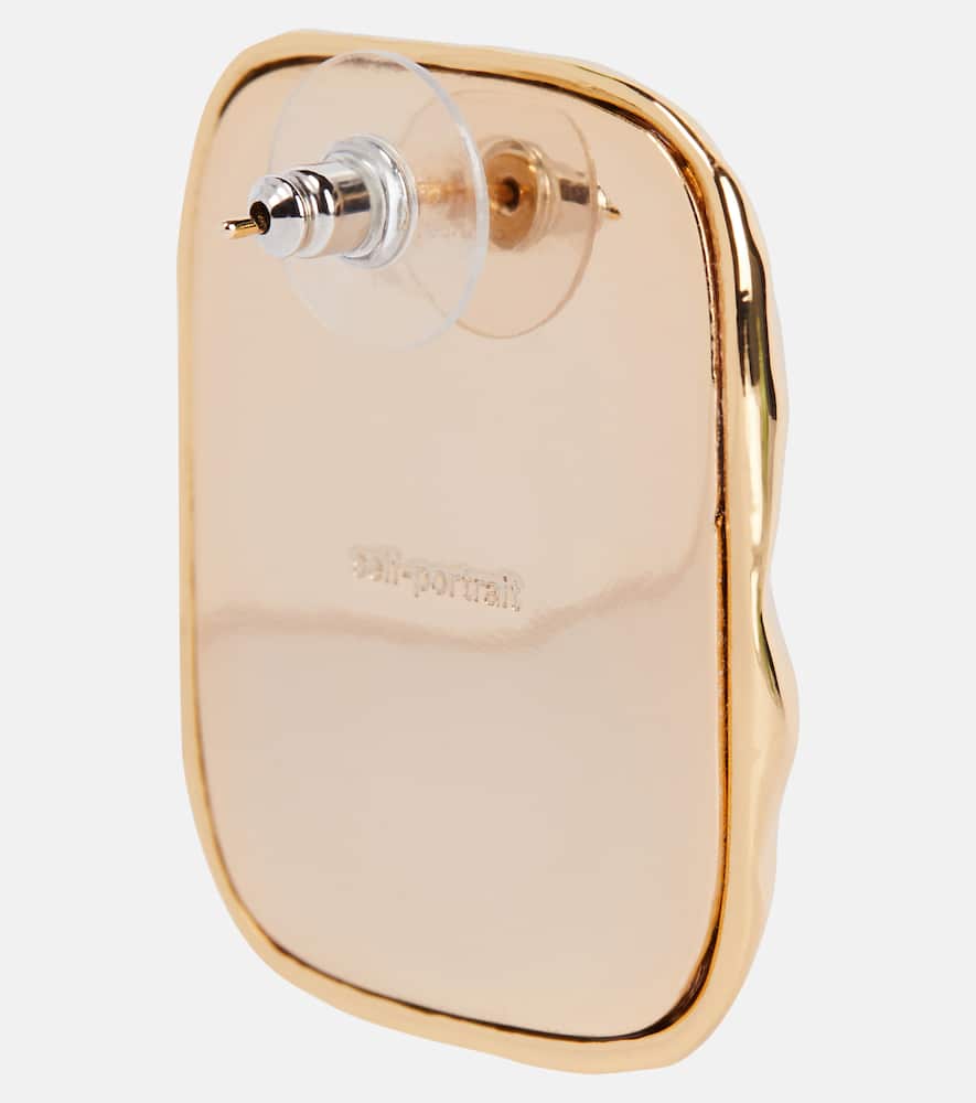 These Self-Portrait Enamel earrings are a vibrant and artistic statement piece. Crafted from a blend of brass and rhinestone, these earrings feature a striking enamel design that adds a pop of color and a touch of playful glamour. The intricate shape and shimmering details catch the light beautifully, making them a perfect accessory for special occasions. These earrings are designed to be a bold and confident expression of personal style.