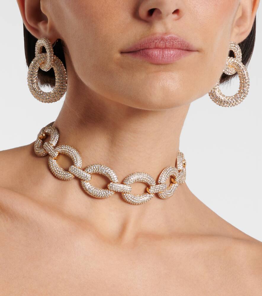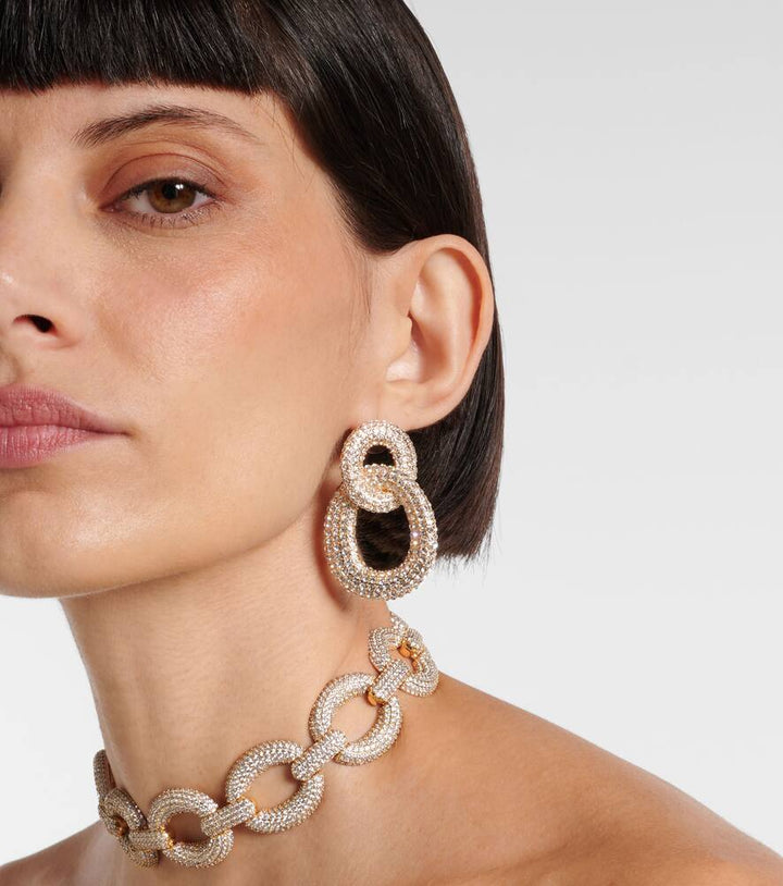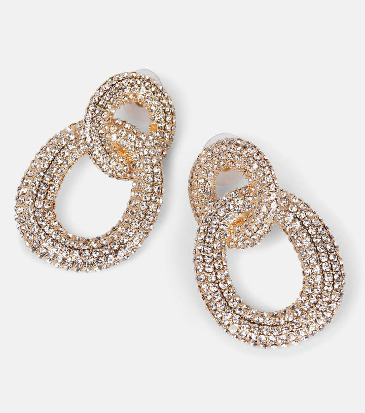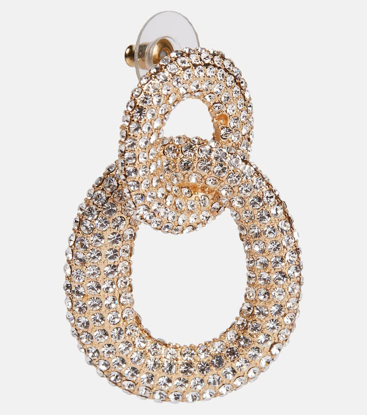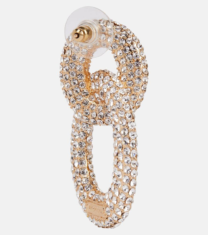 These Self-Portrait Crystal-embellished earrings are a dazzling and glamorous accessory. Crafted in China from brass, these earrings feature a stunning arrangement of shimmering crystal glass in a beautiful, intricate design. The delicate shape and radiant sparkle make them a perfect statement piece for special occasions. The pin fastening ensures a comfortable and secure fit for pierced ears, allowing you to wear them with confidence and style.