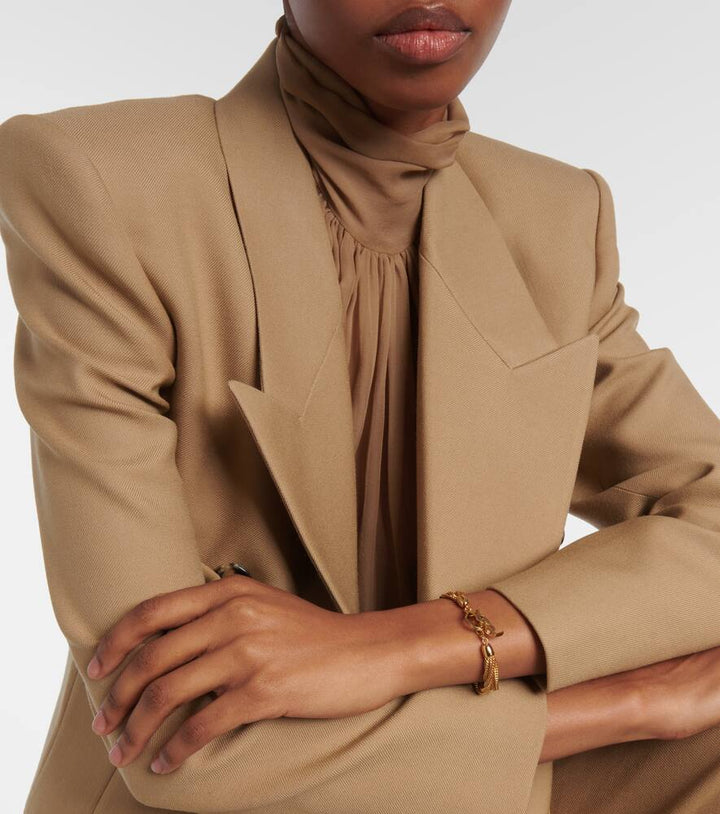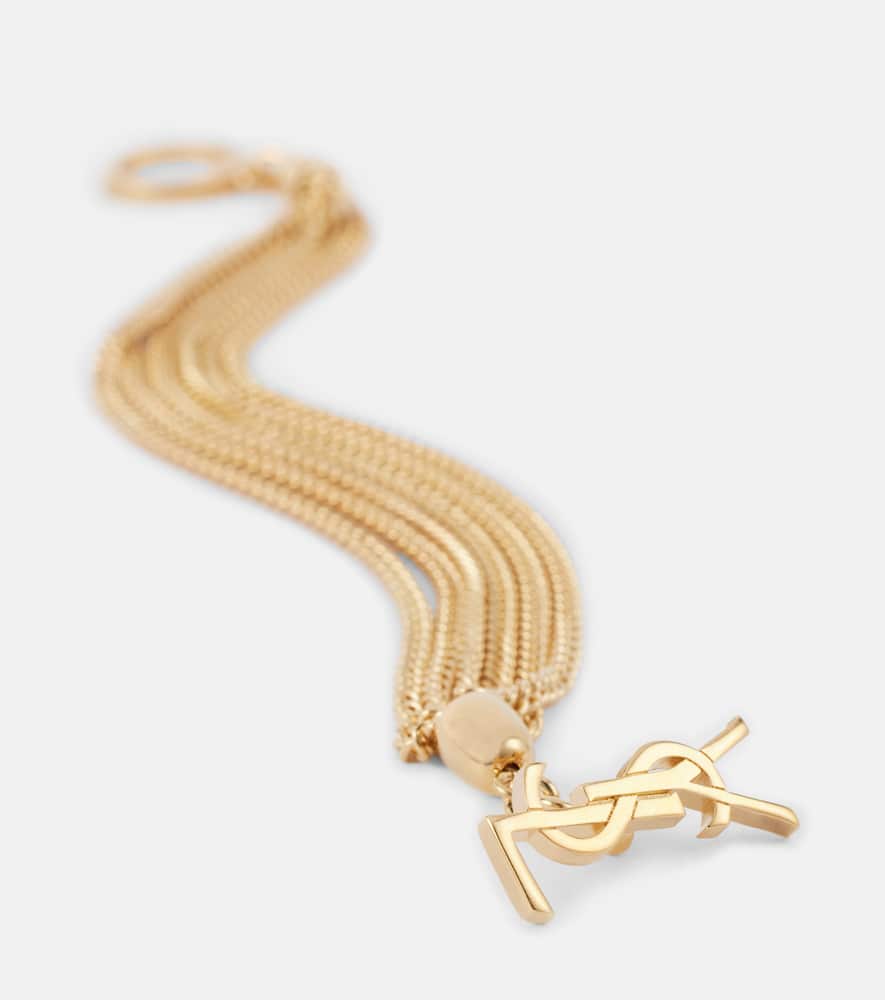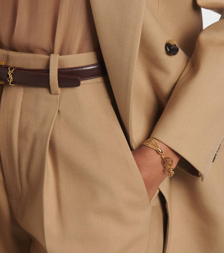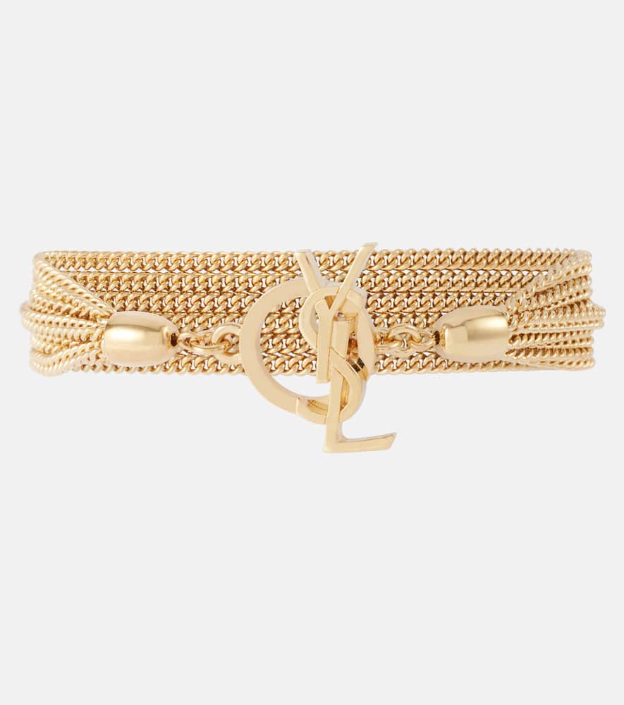 This Saint Laurent YSL bracelet is a bold and elegant statement piece that embodies the brand's iconic aesthetic. Crafted from polished brass with a radiant gold finish, the bracelet features a unique, chunky chain design. The secure toggle fastening adds a modern and stylish touch. This versatile bracelet is perfect for adding a touch of sophisticated style and brand recognition to your everyday look, whether worn alone or stacked with other bracelets.