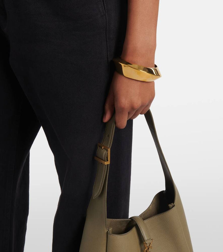 This Saint Laurent Asymmetric bangle is a bold and modern statement piece. Crafted in Italy from polished brass, this bangle features a unique asymmetric shape that elegantly wraps around the wrist. The sculptural design and radiant gold finish make it a powerful accessory that can be worn alone to make a strong fashion-forward statement. This piece is an essential for those who appreciate contemporary and artful design.