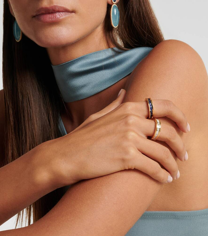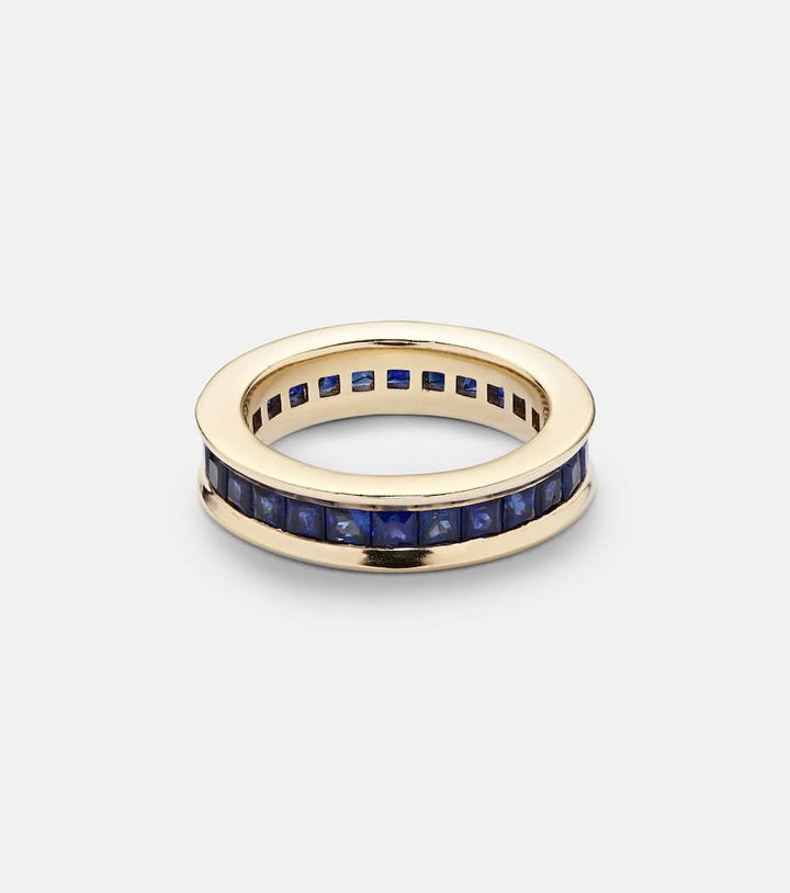 This Octavia Elizabeth Ivy Eternity 18kt gold ring with sapphire is a timeless and elegant piece that embodies refined luxury. Crafted in the USA from 18kt yellow gold, this eternity band is beautifully adorned with a continuous row of square-cut sapphires, totaling 3.38ct. The deep blue sapphires are set in a secure channel setting, creating a rich and sophisticated look. This ring is a perfect statement of enduring beauty, ideal for wearing alone or stacking with other pieces.