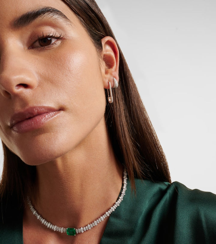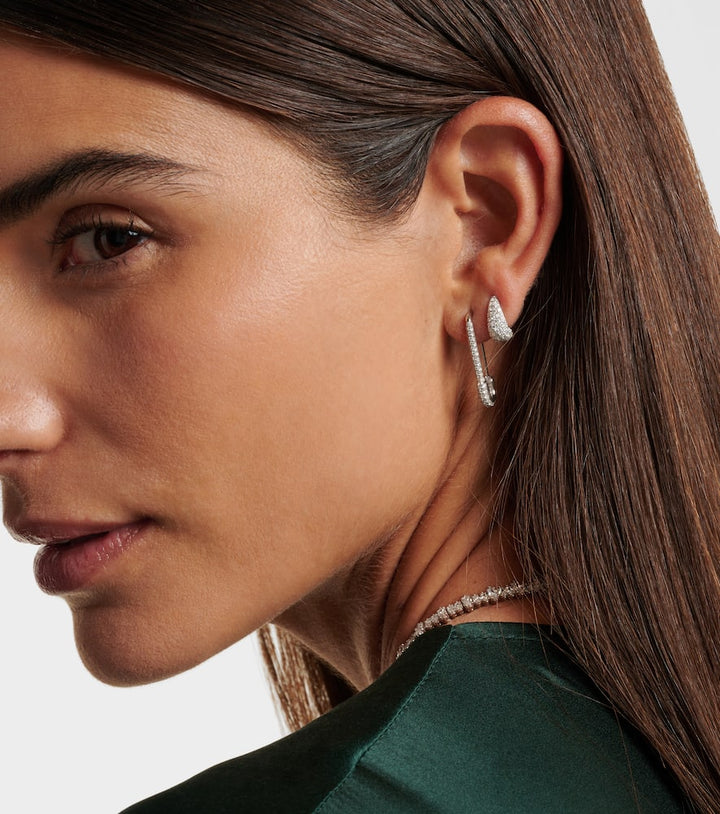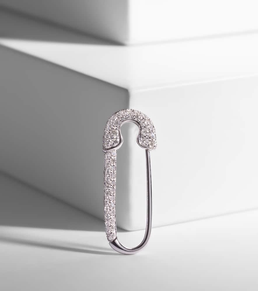 This Anita Ko 18kt white gold safety pin single earring with diamonds is a modern and edgy piece that redefines classic luxury. Crafted in the USA from 18kt white gold, this single earring features a unique safety pin design, beautifully adorned with a pavé of sparkling diamonds (0.46ctw). The intricate detailing and brilliant shine give it a sophisticated, rebellious feel. This earring is perfect for adding a touch of modern, fashion-forward glamour to your look.