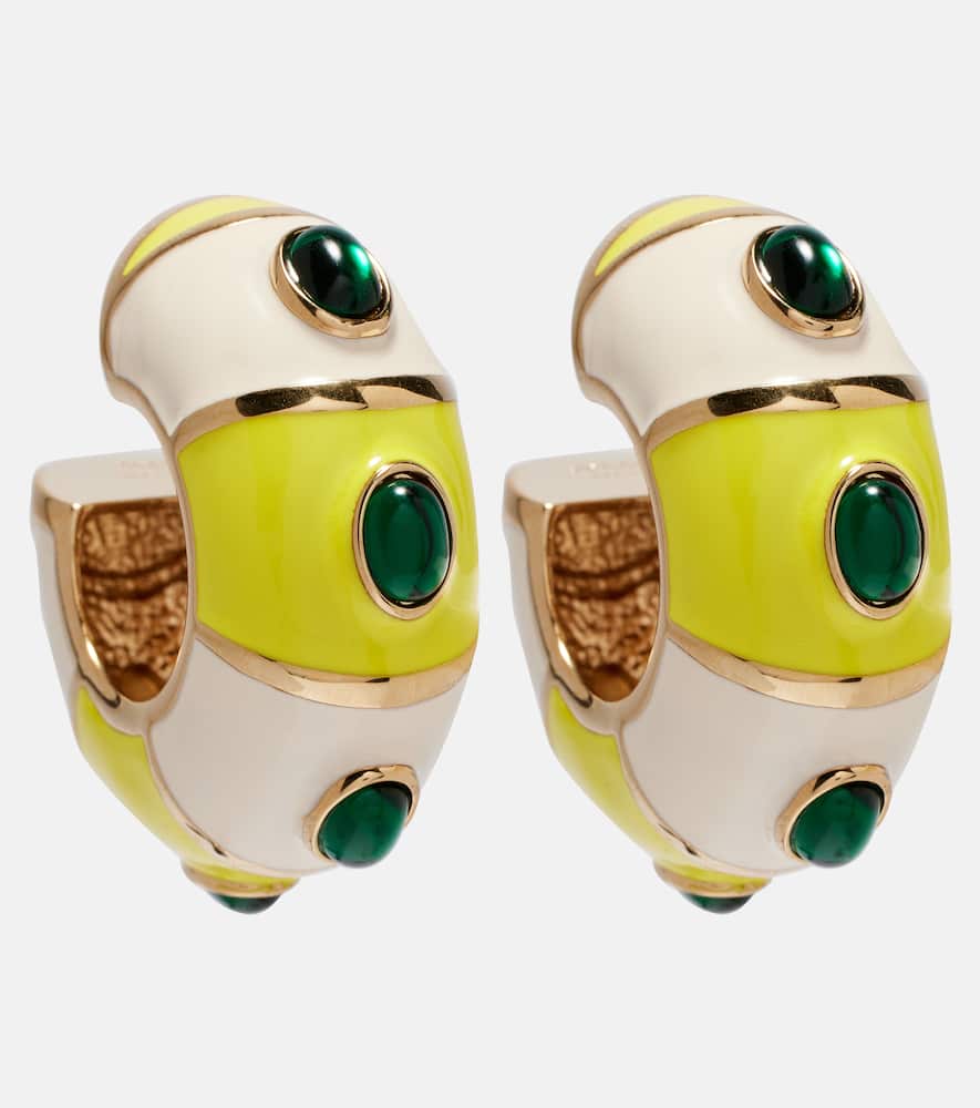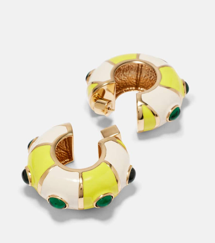 These Jacquemus Rayures embellished hoop earrings are a modern and playful accessory. Crafted in Italy from brass, these hoops feature a unique enamel detail that adds a touch of artistic flair. The post-back fastening ensures a secure fit for pierced ears. These earrings are a perfect statement piece to add a pop of color and a hint of Jacquemus's signature minimalist yet bold aesthetic to any look, from a casual daytime outfit to an elegant evening ensemble.