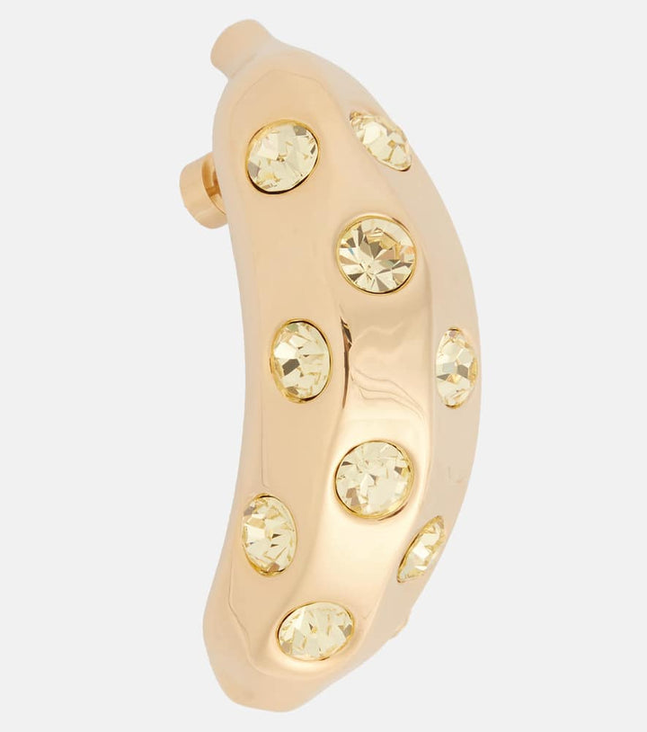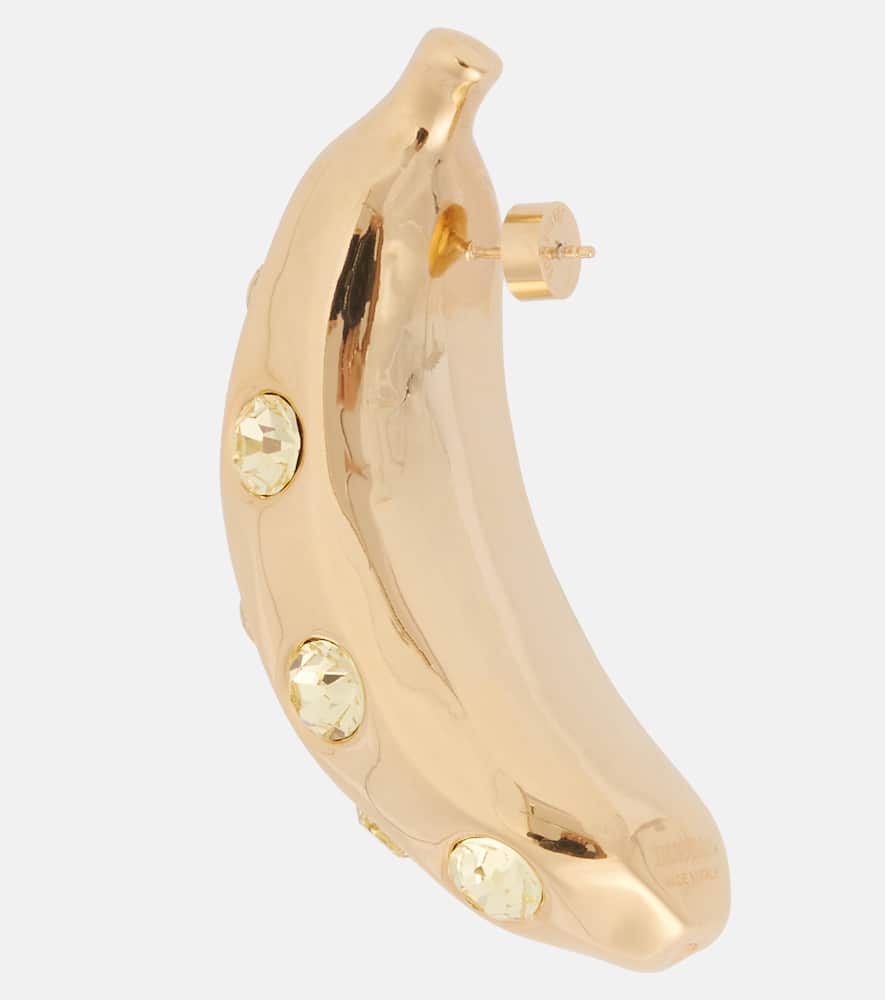 These Jacquemus Bananes crystal-embellished earrings are a whimsical and elegant accessory. Crafted in France from a blend of copper and brass, these earrings feature a unique "banana" shape that is beautifully embellished with shimmering crystal glass. The playful design and radiant sparkle give them a luxurious and lighthearted feel. The post-back fastening ensures a secure fit for pierced ears. These earrings are a perfect statement piece for adding a touch of sophisticated charm to any look.