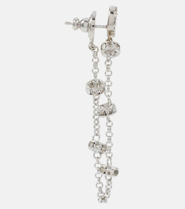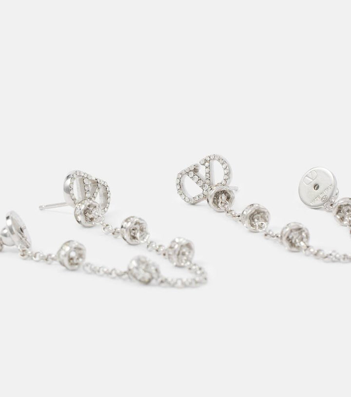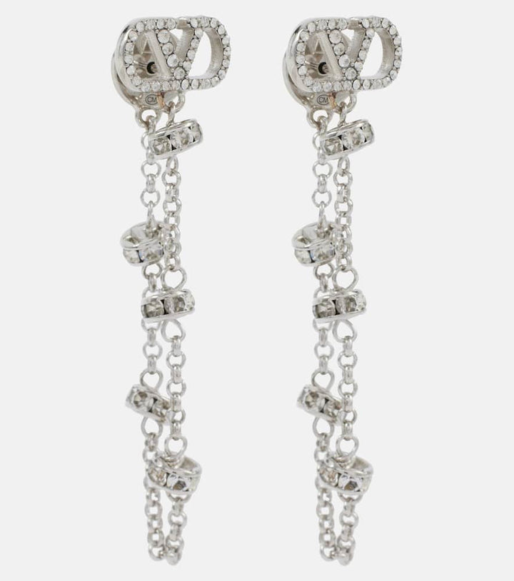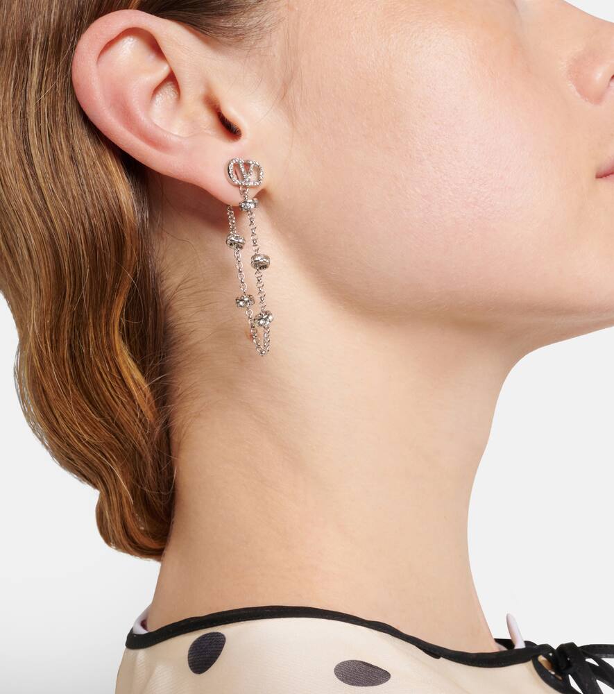 These Valentino VLogo Signature embellished drop earrings are a stunning and glamorous accessory. Crafted in Italy from brass, these drop earrings feature a beautiful design that elegantly suspends the iconic "VLogo" emblem, which is adorned with shimmering crystals. The radiant finish and graceful shape create a sense of movement and luxury. The pin fastening ensures a secure fit for pierced ears. These earrings are perfect for adding a touch of sophisticated drama to any look.