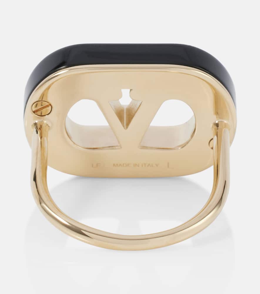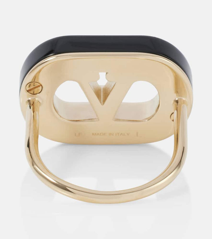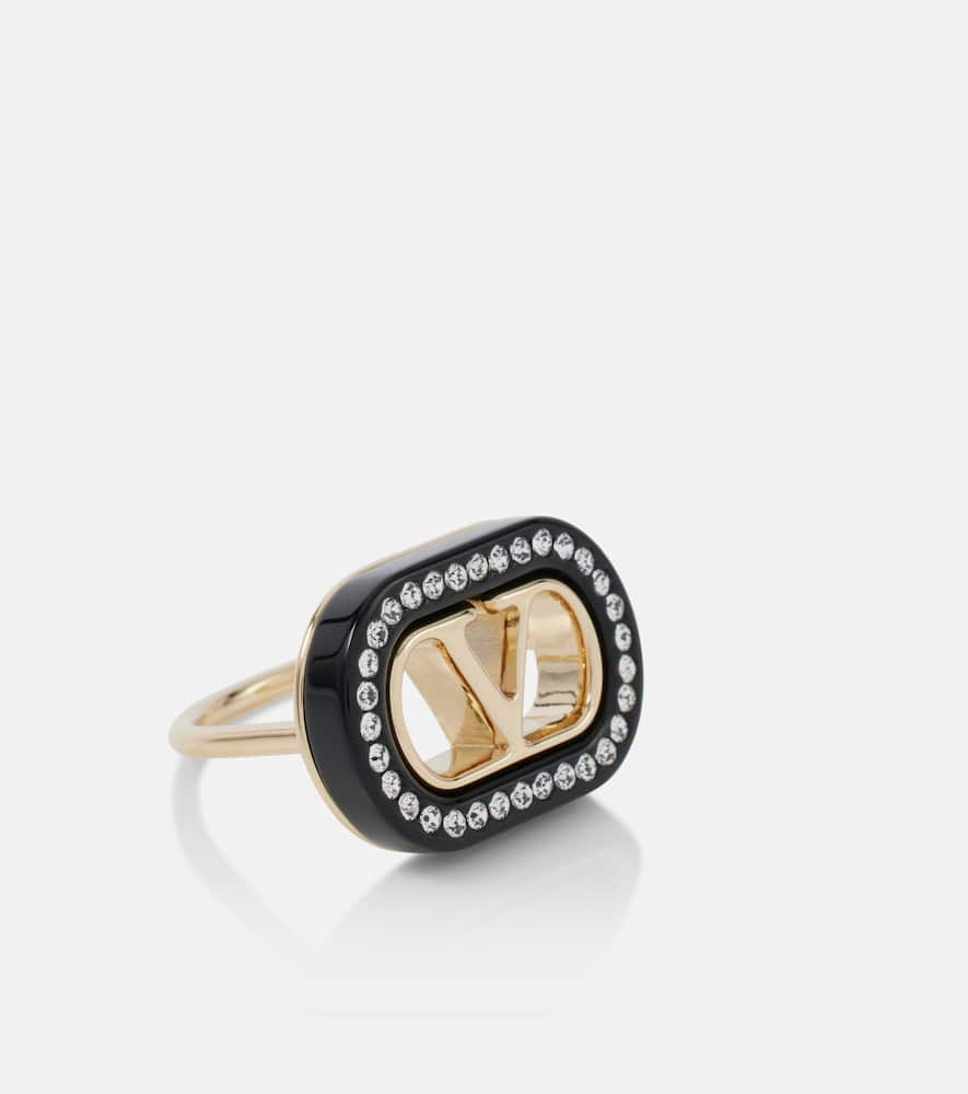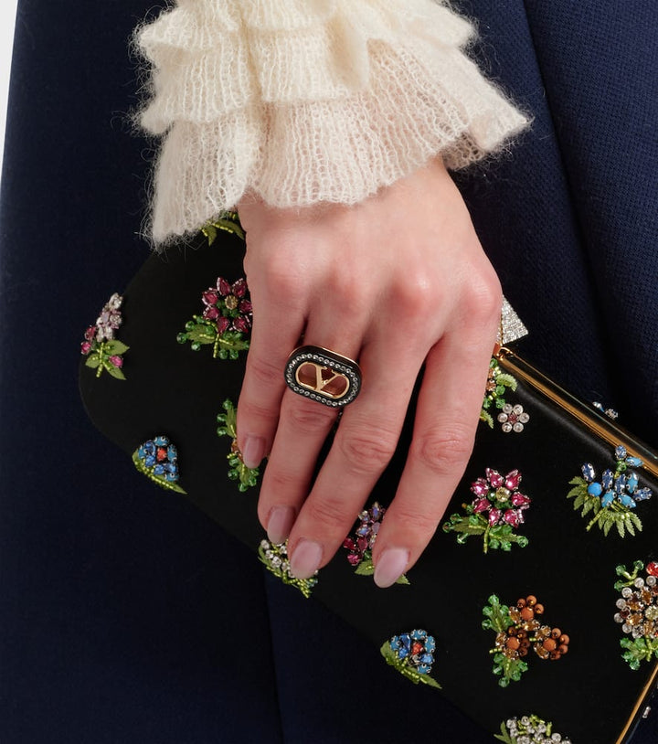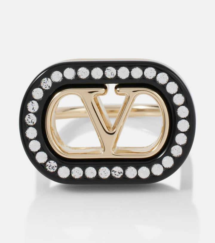 This Valentino VLogo embellished ring is a bold and glamorous statement piece. Crafted in Italy from polished brass, this ring features the iconic "VLogo" emblem which is beautifully outlined in shimmering crystals. The striking design and radiant sparkle give it a luxurious and sophisticated feel. This ring is perfect for adding a touch of signature style and dramatic flair to your look, whether for a special occasion or to elevate your everyday ensemble.