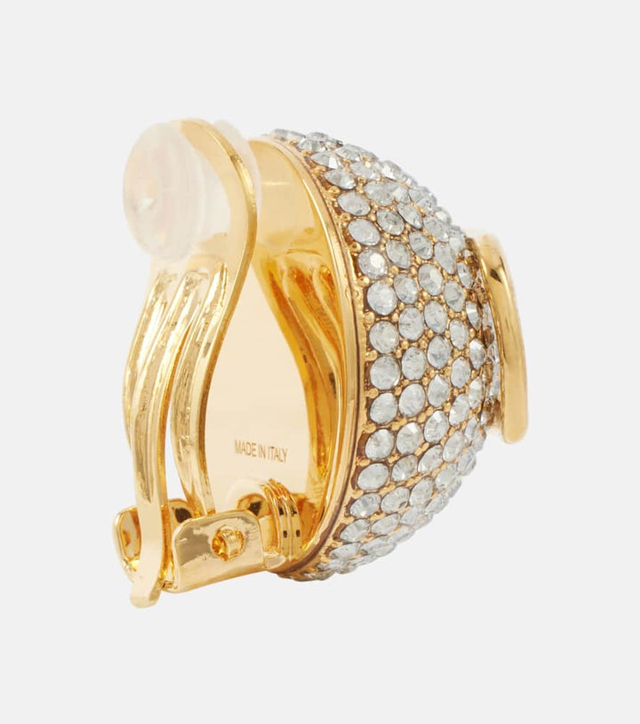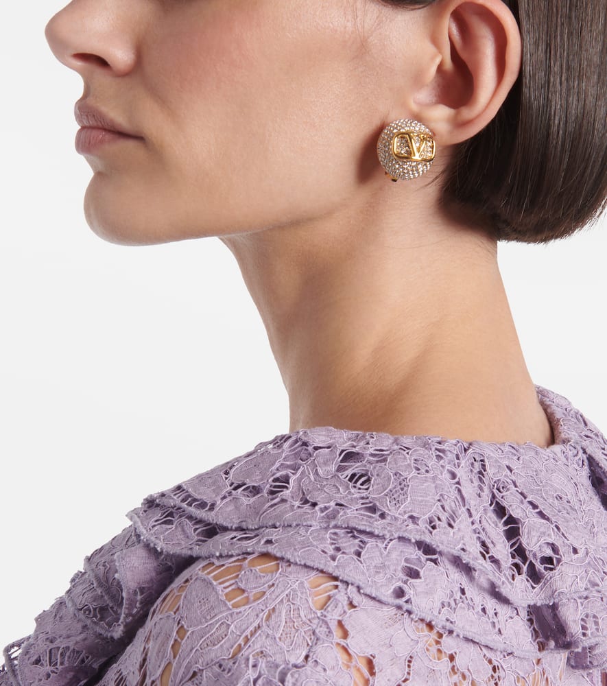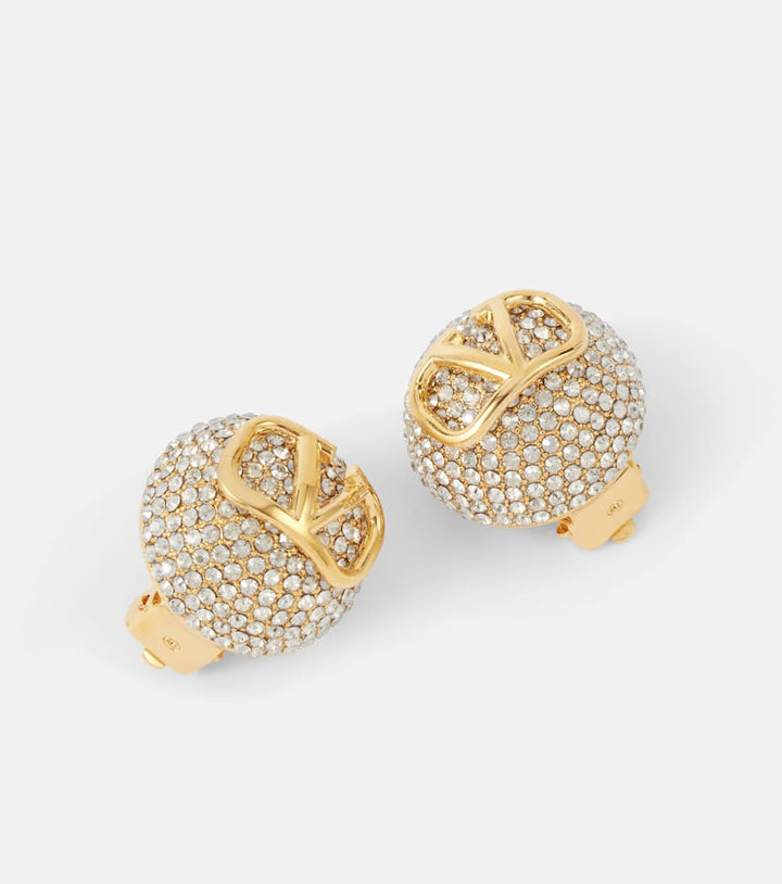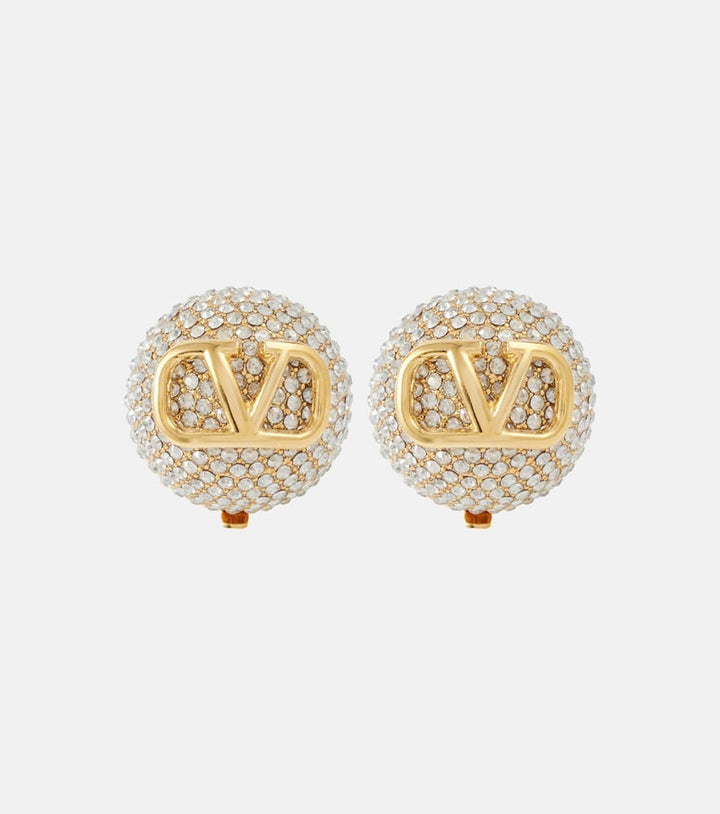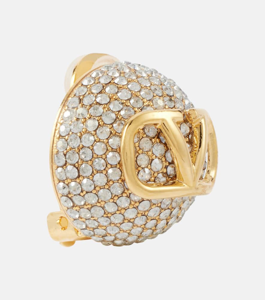 These Valentino VLogo Signature embellished earrings are a bold and glamorous statement piece. Crafted in Italy from polished brass, these earrings feature a prominent design adorned with the iconic "VLogo" emblem. The striking silhouette and radiant finish give them a powerful yet elegant feel. The secure clip-on fastening ensures a comfortable fit for those with or without pierced ears. These earrings are perfect for adding a touch of signature style and dramatic flair to any look.