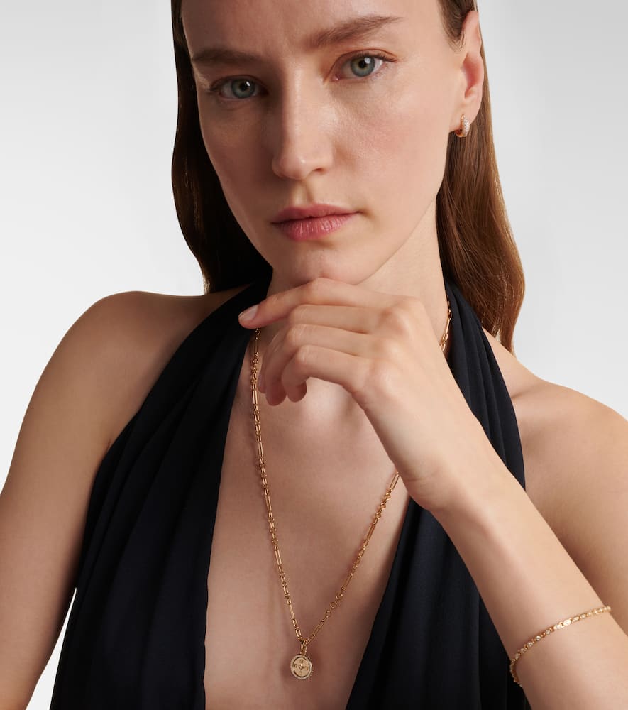 This necklace is made in the USA from 18kt yellow gold and features a 0.136ct diamond. The pendant is 25mm (1 inch) long and 16mm (0.65 inches) wide.
