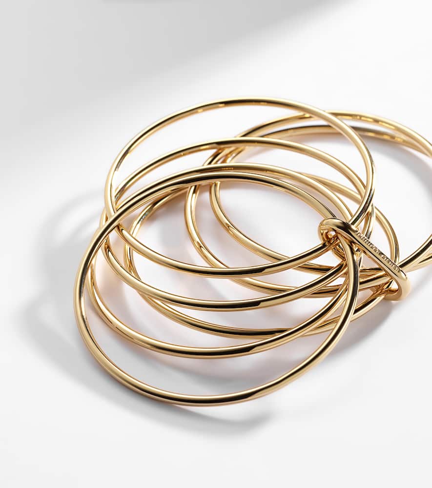 This set of 7 bangles is made in China from brass plated with 10kt yellow gold. The max. width of the stack is 22 mm (0.85 inches), and the circumference is 20 cm (8 inches).