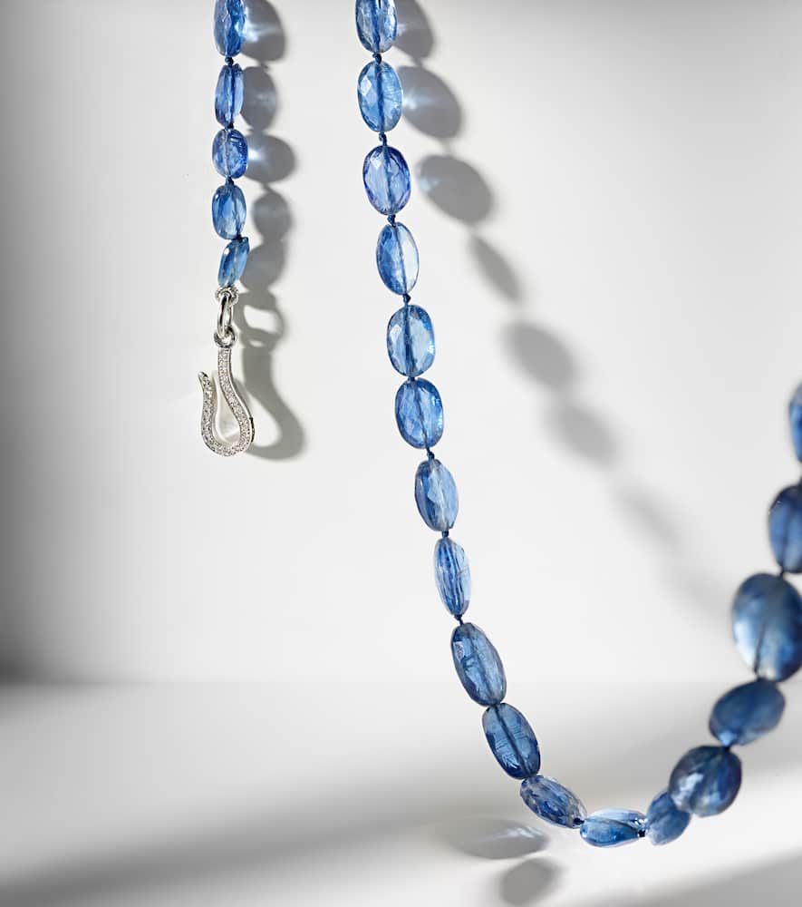 This necklace is made in Greece from 18kt white gold with blue kyanite beads and 0.18ct of diamonds. It has a hook closure. The length when open is 52.5 cm (20.5 inches), the min. width is 5 mm (0.2 inches), and the max. width is 11 mm (0.45 inches).