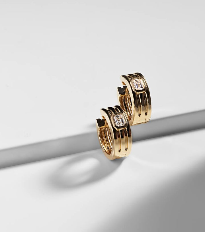 These earrings are made in India from 14kt yellow gold and feature 0.3ctw of emerald-cut diamonds. The width is 5mm (0.2 inches) and the inner diameter is 11mm (0.45 inches).