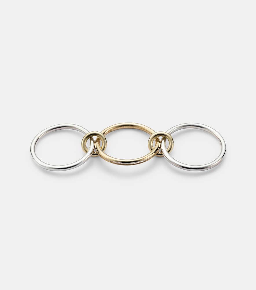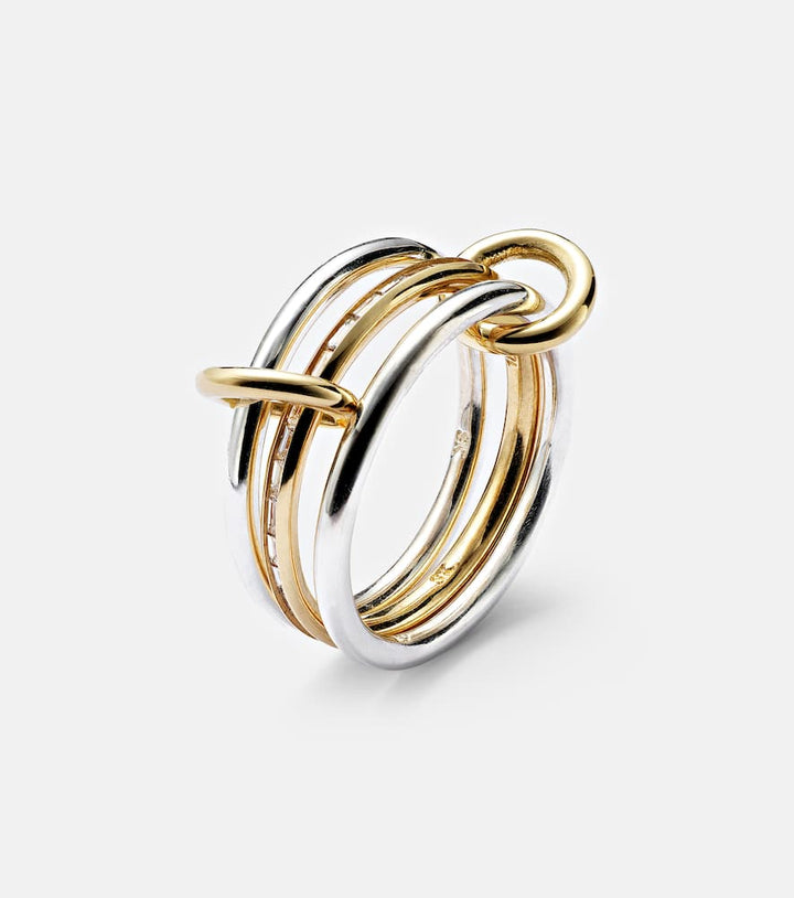 This Spinelli Kilcollin Sonja SG 18kt gold and sterling silver ring with diamonds is a modern and architectural masterpiece. Crafted in the USA, this ring features a unique design of interconnected bands in 18kt yellow gold and 925 sterling silver. One of the bands is beautifully adorned with a channel-setting of baguette-cut diamonds (0.55ct), creating a stunning contrast between the mixed metals and the brilliant sparkle. This ring is a perfect statement of sophisticated and contemporary style.