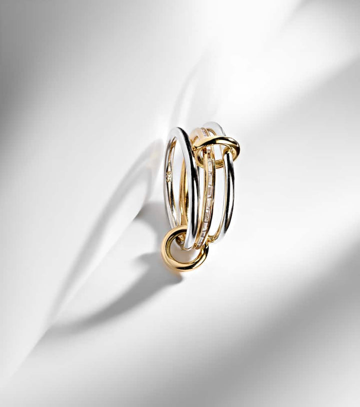 Spinelli Kilcollin is a luxury jewelry brand founded by designer Yves Spinelli and his wife, Dwyer Kilcollin, known for its innovative and contemporary designs. The brand’s signature style is the 'Galaxy Rings,' a series of interconnected, stackable bands that can be worn across multiple fingers or stacked on one. Crafted from a mix of gold, sterling silver, and diamonds, Spinelli Kilcollin's pieces blend minimalism with versatility. Their designs emphasize modern elegance and modularity, offering a bold yet refined aesthetic that appeals to those seeking unique, multifunctional jewelry.