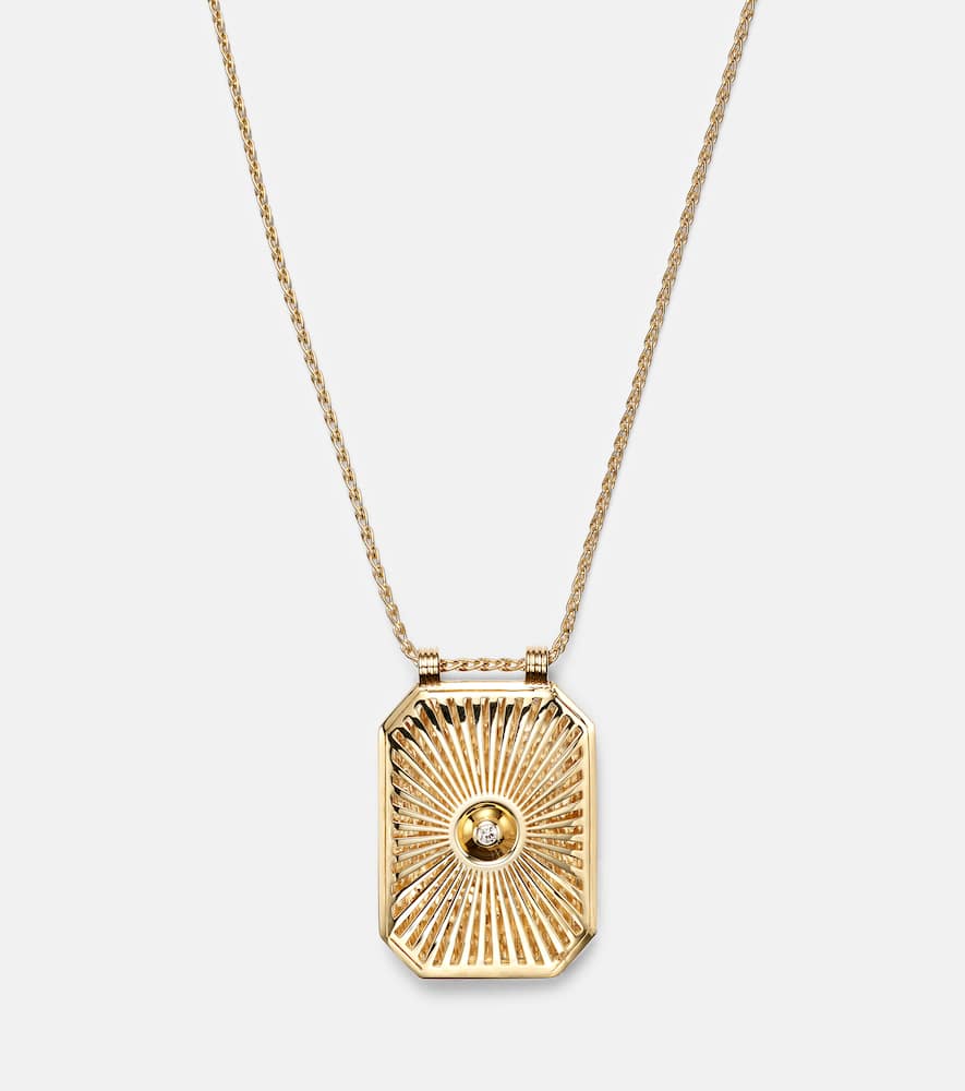 This necklace is crafted from 18kt yellow gold and features 31 round-cut diamonds with an SI clarity grade, G color grade, and a total carat weight of 0.11ct. The pendant measures 31mm (1.2") in length and 19mm (0.75") in width. The open length of the chain is 44.5cm (17.5"). Made in Thailand.