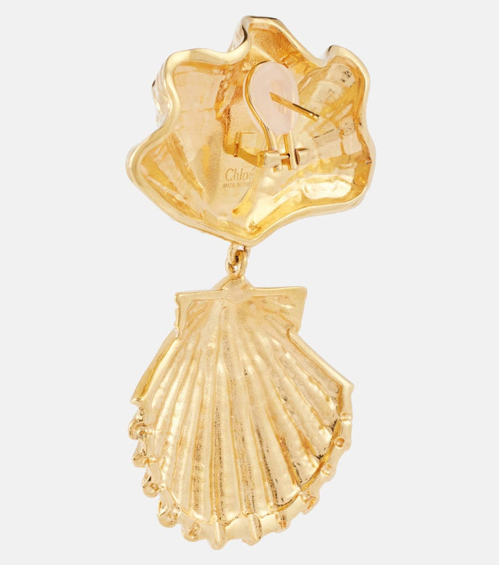 These Chloé Shells drop earrings by Chloé are a striking and elegant accessory. The earrings feature a delicate brass design that holds a beautiful, polished shell, creating a sense of natural beauty and graceful movement. The clean lines and intricate detail of the shell make these earrings a perfect statement piece. They are ideal for adding a touch of sophisticated bohemian glamour to an evening look, symbolizing a love for the ocean and a refined, artistic style.