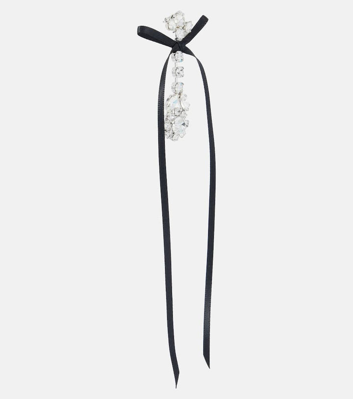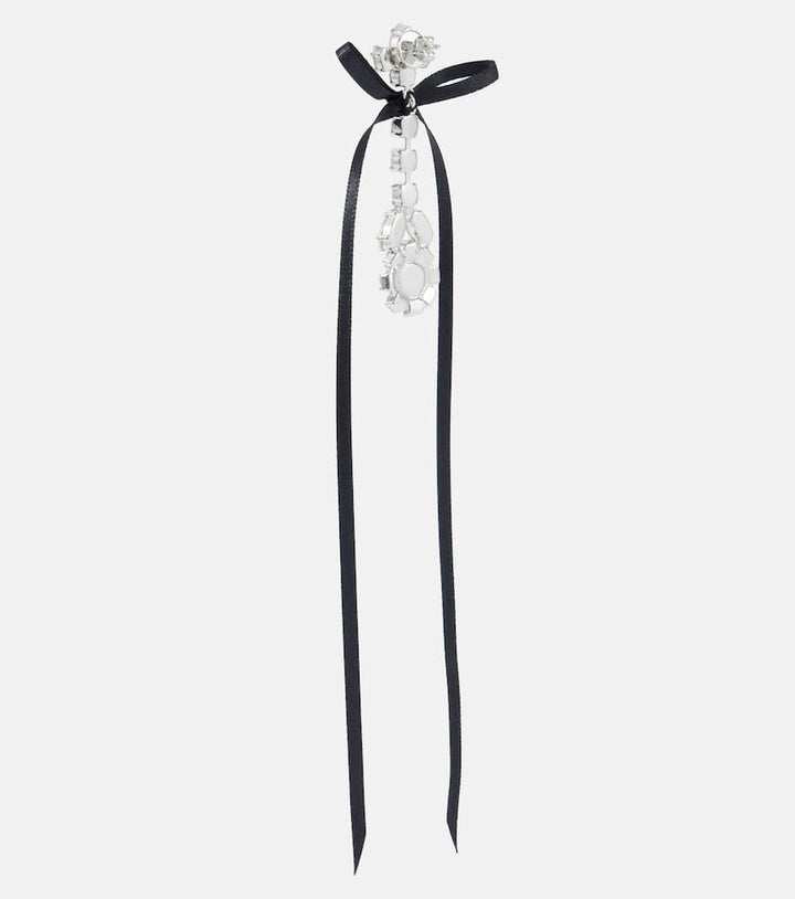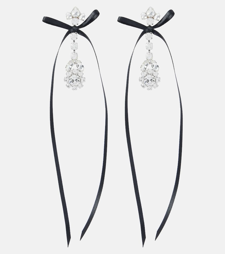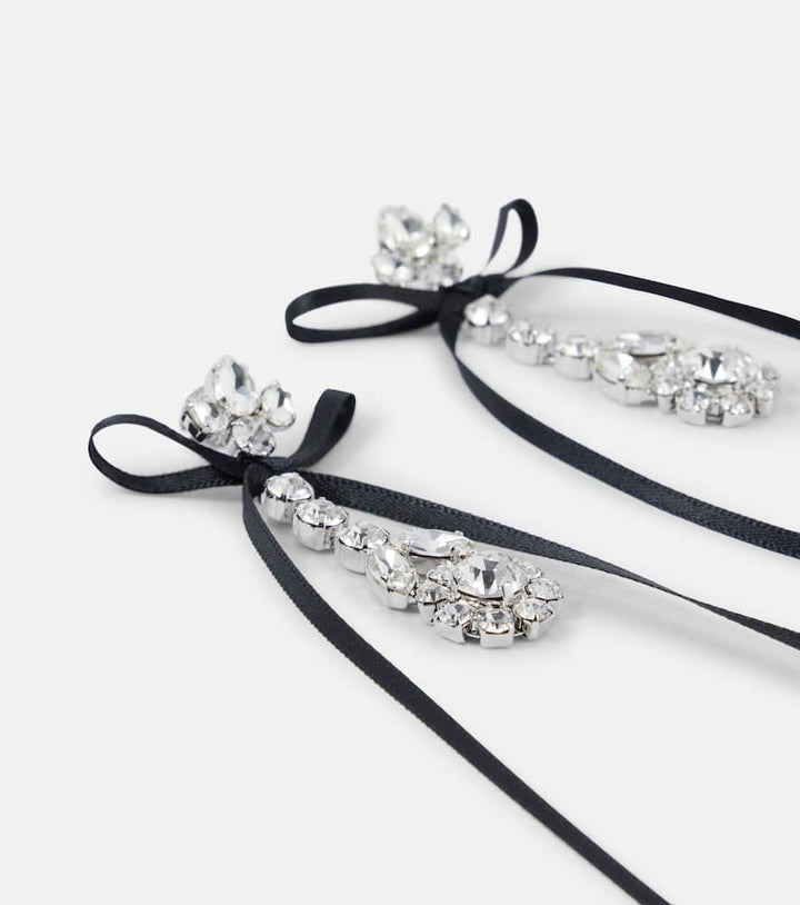 These Bow-detail embellished drop earrings by Simone Rocha are a whimsical and dramatic accessory. The earrings feature a delicate bow design crafted from crystal, creating a beautiful contrast between a classic feminine shape and a modern, edgy material. The cascading length and striking crystal embellishments make them a perfect statement piece for a special occasion. They are ideal for adding a touch of romantic elegance to an evening outfit, symbolizing a captivating and unique personal style.