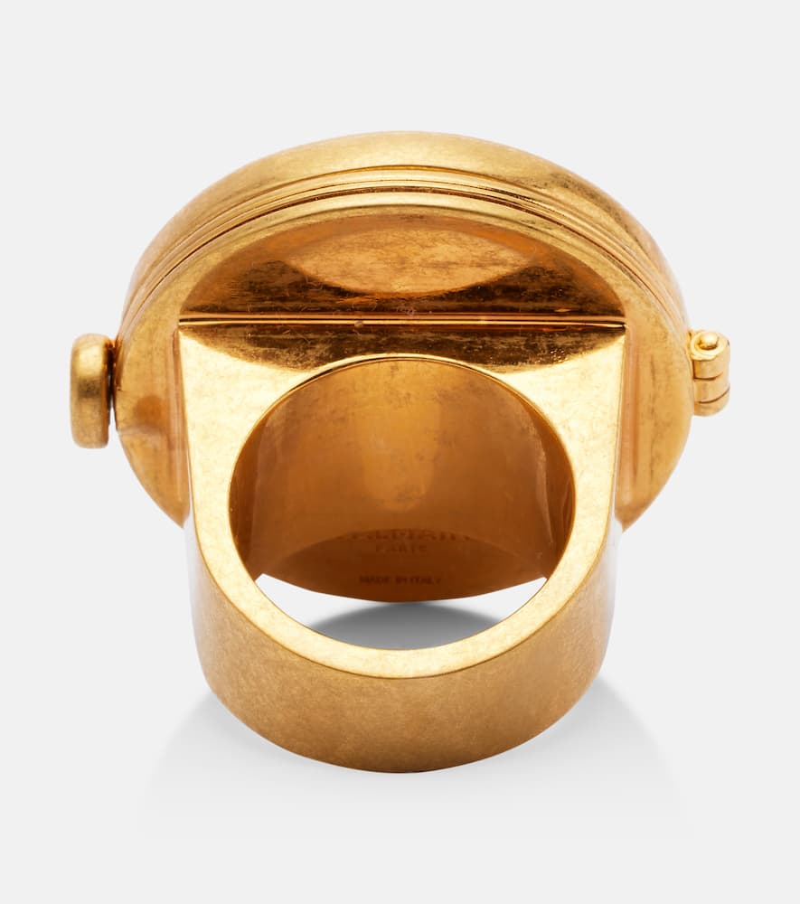 This Powder Compact ring by Balmain is a bold and luxurious statement piece. The ring is crafted from polished brass and features a unique and sculptural design, reminiscent of a vintage powder compact. The sleek lines and glossy finish give it a modern and sophisticated edge, while the intricate detailing adds a touch of classic glamour. This ring is a perfect accessory for adding a powerful and confident touch to any look, symbolizing a unique and refined personal style.