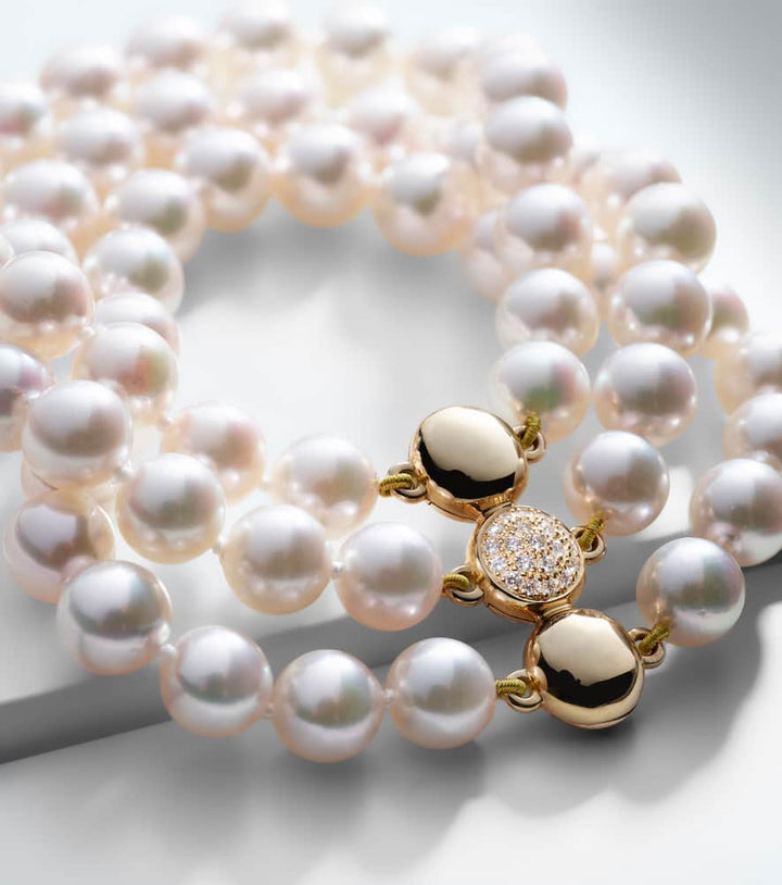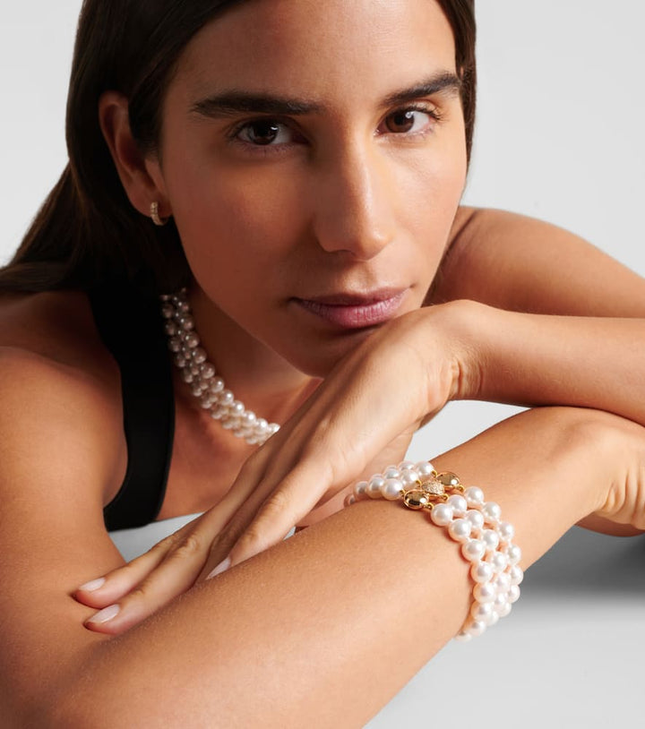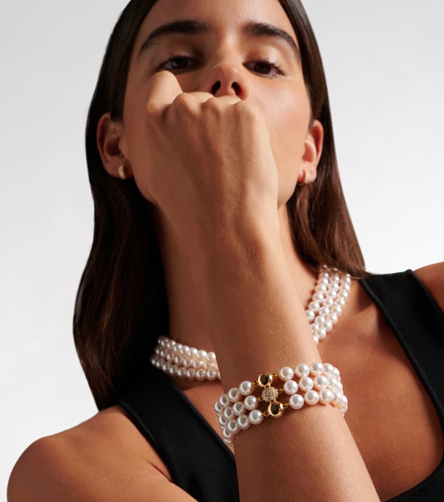 Handcrafted in 18kt yellow gold with 20 brilliant-cut diamonds (0.24ct, VS, F–G) and Akoya cultivated pearls (Pinctada fucata, farmed, not CITES-listed). Circumference 16cm (6.5"); Max width 26mm (1"). Magnetic clasp. Made in Switzerland.