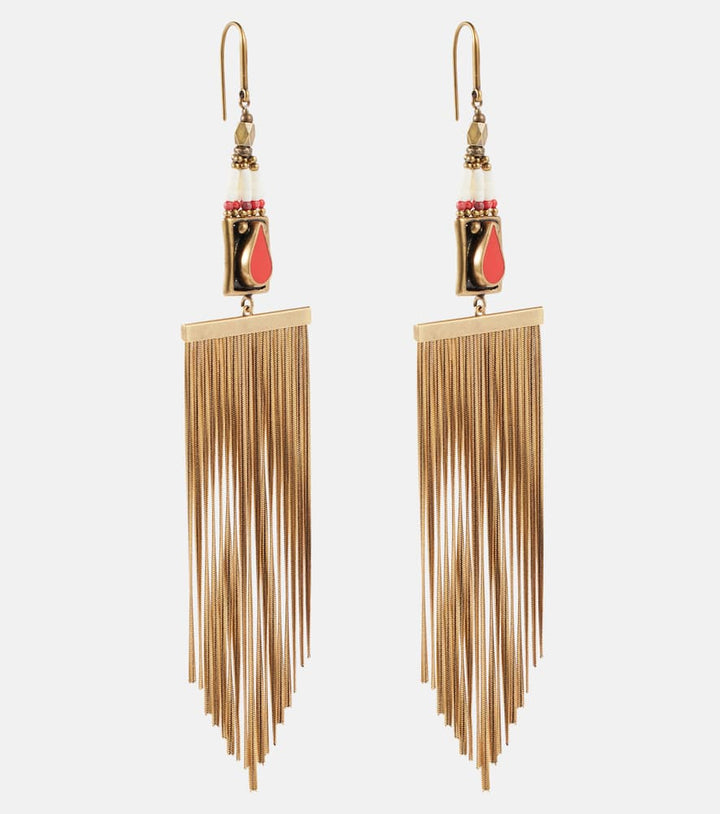 These Jaya Drop Earrings by Isabel Marant are a statement of bold contemporary elegance. Crafted from brass with natural buffalo bone, stone, and resin insets, the 17cm-long earrings feature a dramatic silhouette with 3.5cm width, perfect for elevating eveningwear or making a modern statement. Their mixed-material construction combines artisanal craftsmanship with textural sophistication, reflecting the brand’s avant-garde approach to jewelry. Ideal for those seeking a striking, high-fashion accessory, the earrings balance sculptural design with luxurious detailing, capturing Isabel Marant’s signature aesthetic of edgy, wearable elegance infused with unique character and craftsmanship.