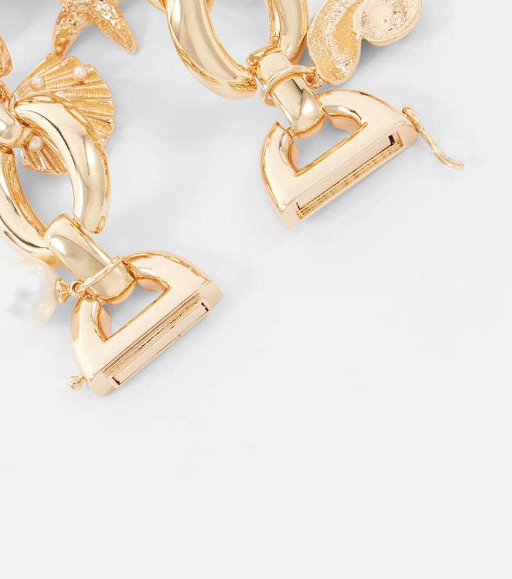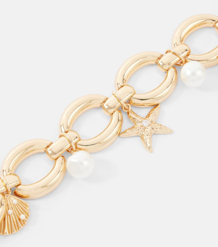 This Faux Pearl Gold-Plated Bracelet by Self-Portrait is a luxurious statement piece. Crafted from brass with plastic pearls and crystal diamonds, it features a 19cm length with a 2.5cm maximum width and pendant dimensions of 2.2 × 2.2cm. Adjustable and versatile, the bracelet exudes elegance while capturing light beautifully. Perfect for layering or standalone wear, it embodies the brand’s signature mix of contemporary glamour, meticulous craftsmanship, and wearable sophistication, offering a refined accessory that elevates both everyday and evening ensembles.