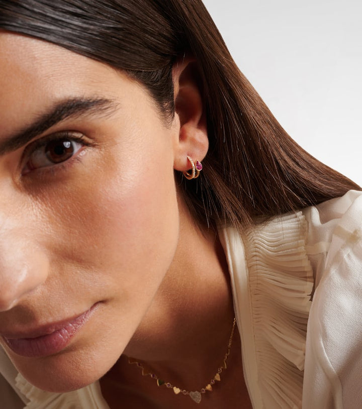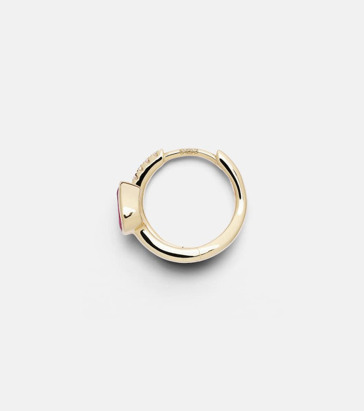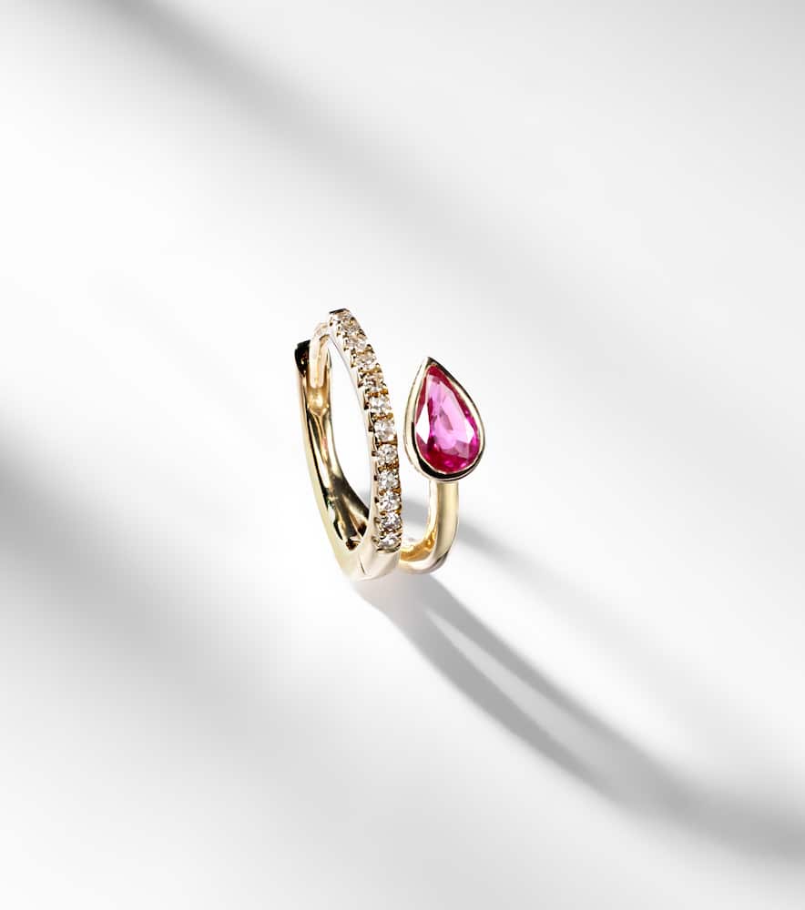 This Single Hoop Earring with Diamonds and Sapphire by Roxanne First is a striking asymmetrical accessory. Handcrafted in 14kt yellow gold, it features 30 pavé-set diamonds (0.06ct) and 1 pear-shaped pink sapphire (0.26ct). Measuring 10mm inner diameter and 5mm width, the safety latch ensures secure wear. This earring embodies Roxanne First’s modern, refined aesthetic, offering a statement piece that balances elegance, color, and craftsmanship for a versatile, luxurious accessory.