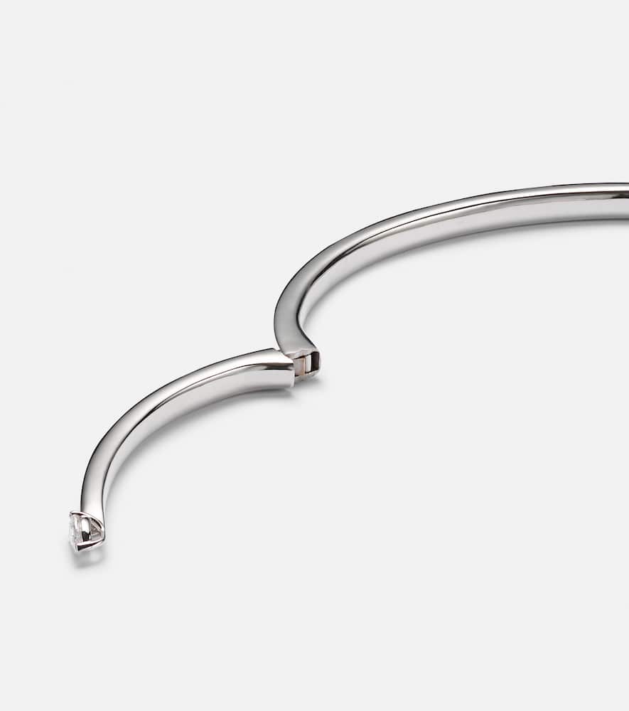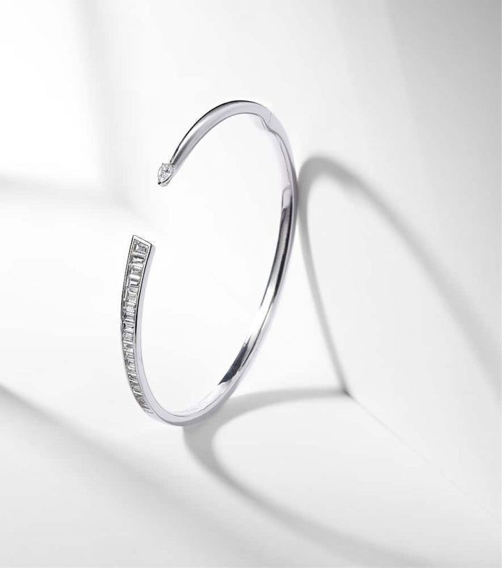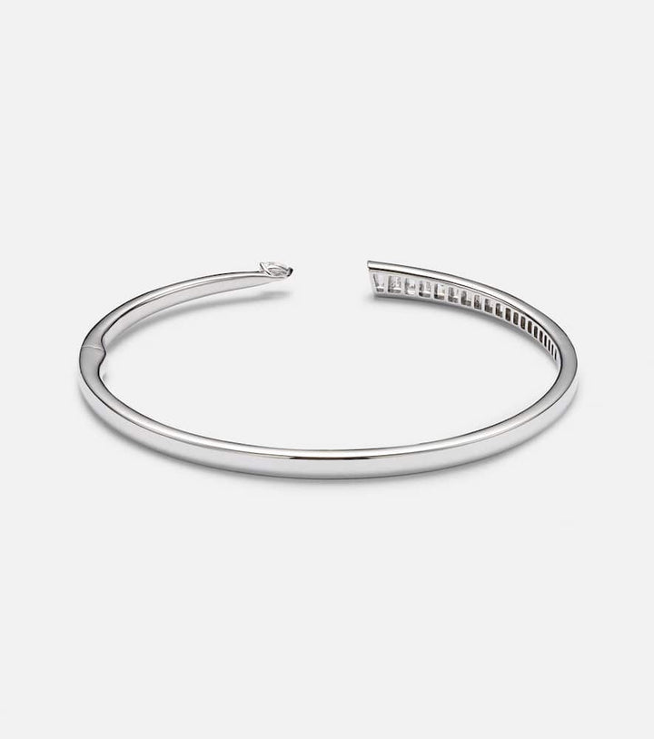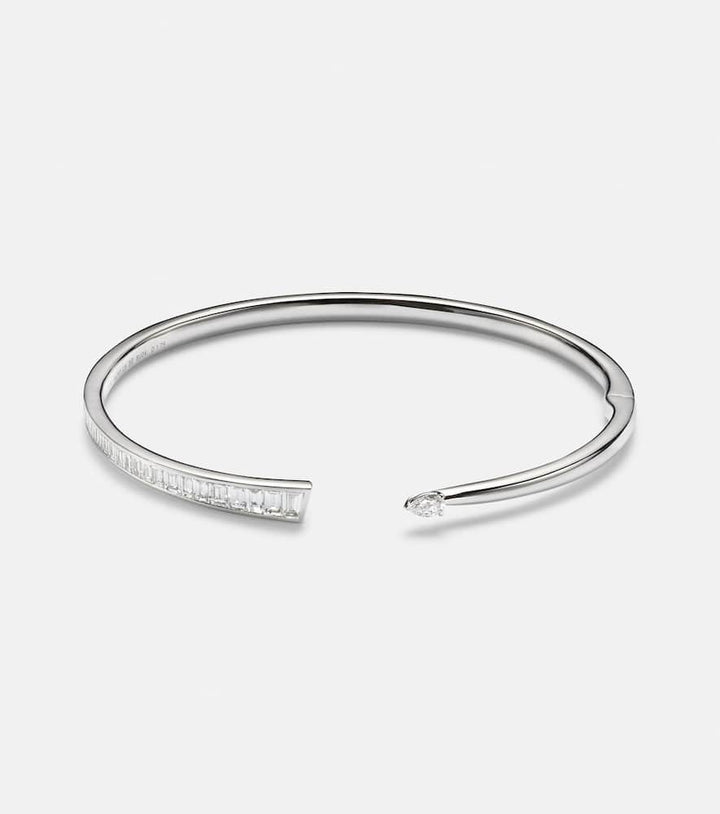 This bangle is made from 18kt white gold with natural diamonds, including 20 baguette-cut diamonds (1.6ctw) and one pear-shaped diamond (0.15ctw). It has a max. width of 4mm (0.15"), a circumference of 19cm (7.5"), and an opening of 1cm (0.5").