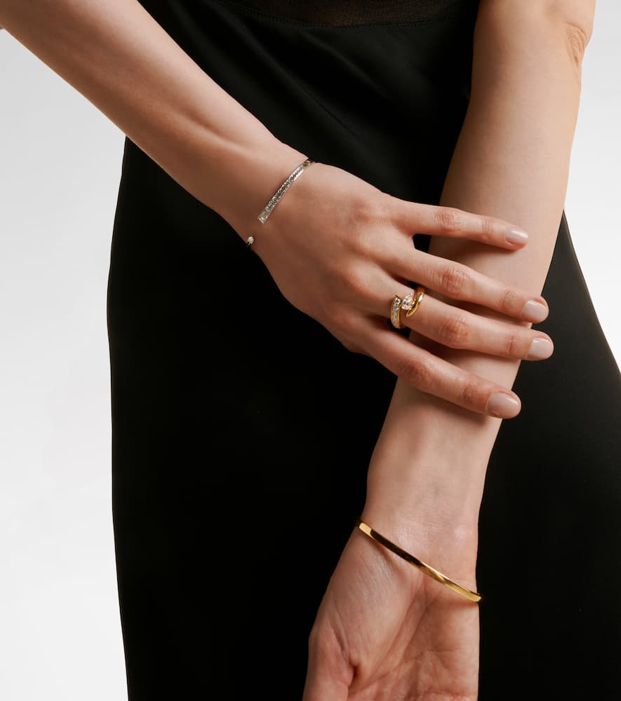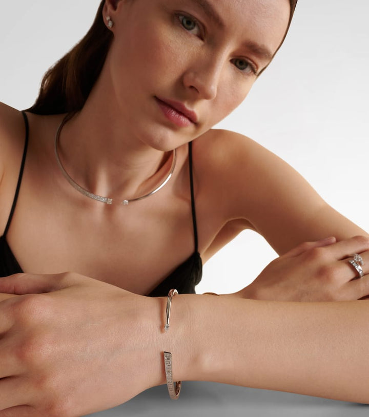 This Inner Fire 18kt white gold bangle with diamonds by BuchererFine Jewellery is a majestic piece that embodies the essence of pure luxury. Crafted from 18kt white gold, the bangle features a unique open design with a brilliant assortment of baguette-cut diamonds (1.6ctw) and a single pear-shaped diamond (0.15ctw). The piece feels both powerful and refined, a true statement of uncompromising quality and a celebration of life's most beautiful moments. This bangle is an accessory that symbolizes enduring elegance and a confident approach to style.