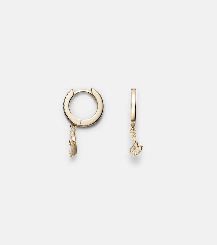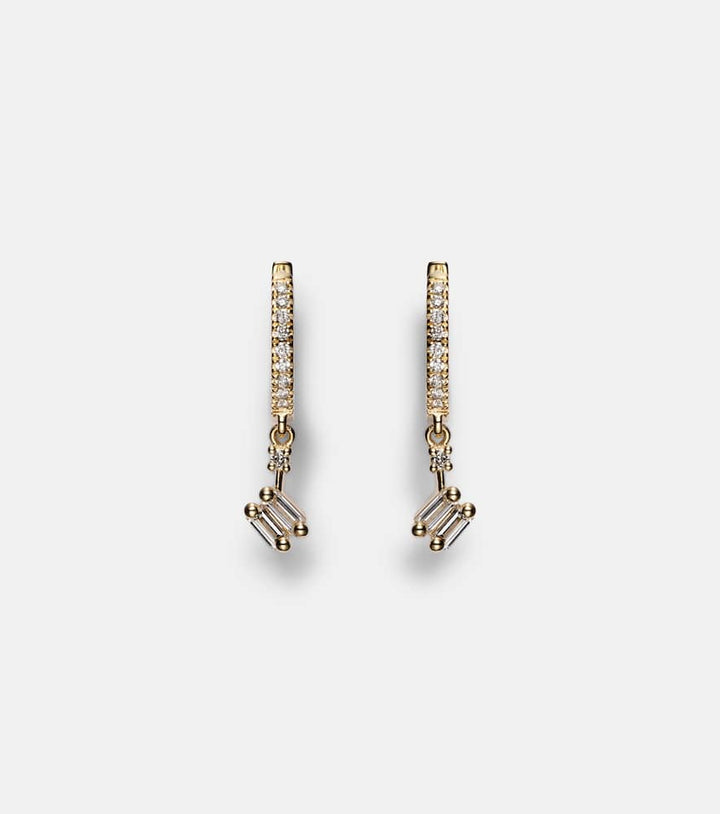 These earrings are handmade in the USA from 18kt yellow gold with 24 diamonds (0.34ct) in round and baguette cuts and a prong setting, with D color and VS clarity grades. They have a hinge closure, a width of 13mm (0.5"), an inner diameter of 8mm (0.3"), a pendant length of 9mm (0.35"), and a pendant width of 5mm (0.2").