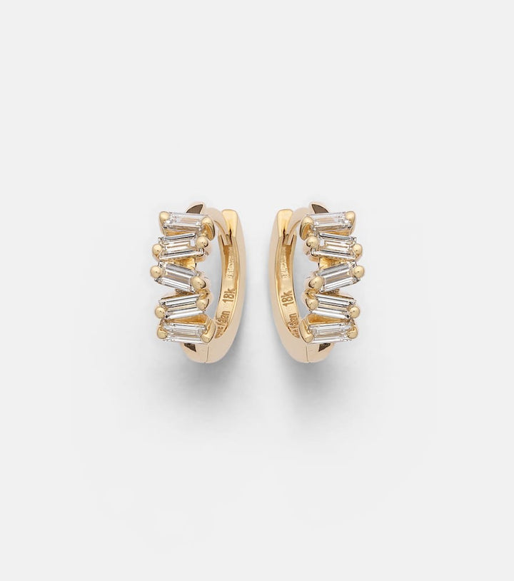 These earrings are made in the USA from 18kt yellow gold with 10 baguette-cut diamonds (0.5ctw) in a prong setting, with D color and VS clarity grades. They have a max. width of 3mm (0.1") and an inner diameter of 8mm (0.3").