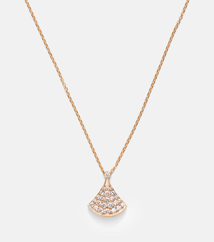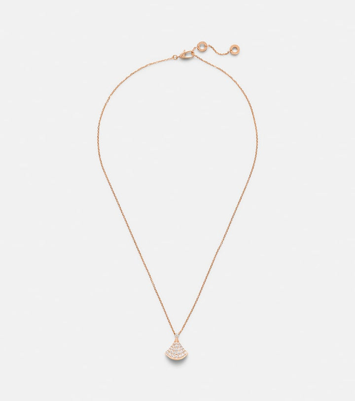 This Diva's Dream 18kt rose gold necklace with diamonds by Bvlgari is a majestic piece that embodies the essence of pure luxury. The necklace's elegant fan-shaped design is expertly crafted from 18kt rose gold and is beautifully adorned with a brilliant collection of 25 round-cut diamonds. The piece feels both powerful and refined, a true statement of uncompromising quality and a celebration of life's most beautiful moments. This necklace is an accessory that symbolizes enduring elegance and a confident approach to style.