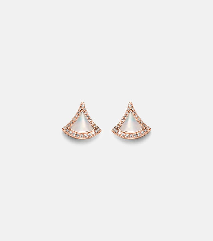 These Divas' Dream 18kt rose gold earrings with mother-of-pearl and diamonds by Bvlgari are a majestic piece that embodies the essence of pure luxury. The earrings' delicate fan-shaped design is expertly crafted from 18kt rose gold and is beautifully adorned with a captivating mother-of-pearl inlay and a brilliant pavé of diamonds. The pieces feel both powerful and refined, a true statement of uncompromising quality and a celebration of life's most beautiful moments. These earrings are an accessory that symbolizes enduring elegance and a confident approach to style.