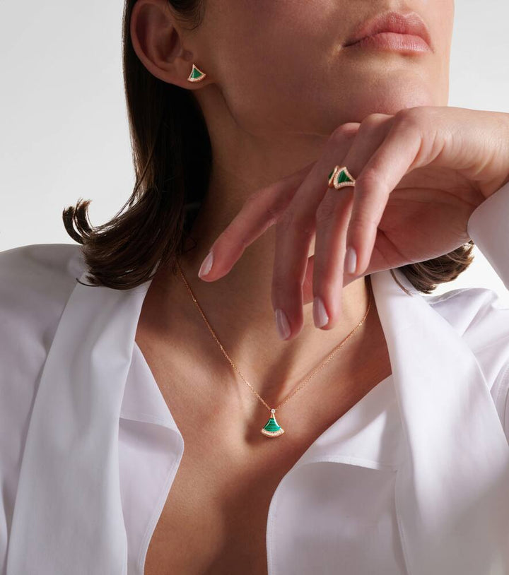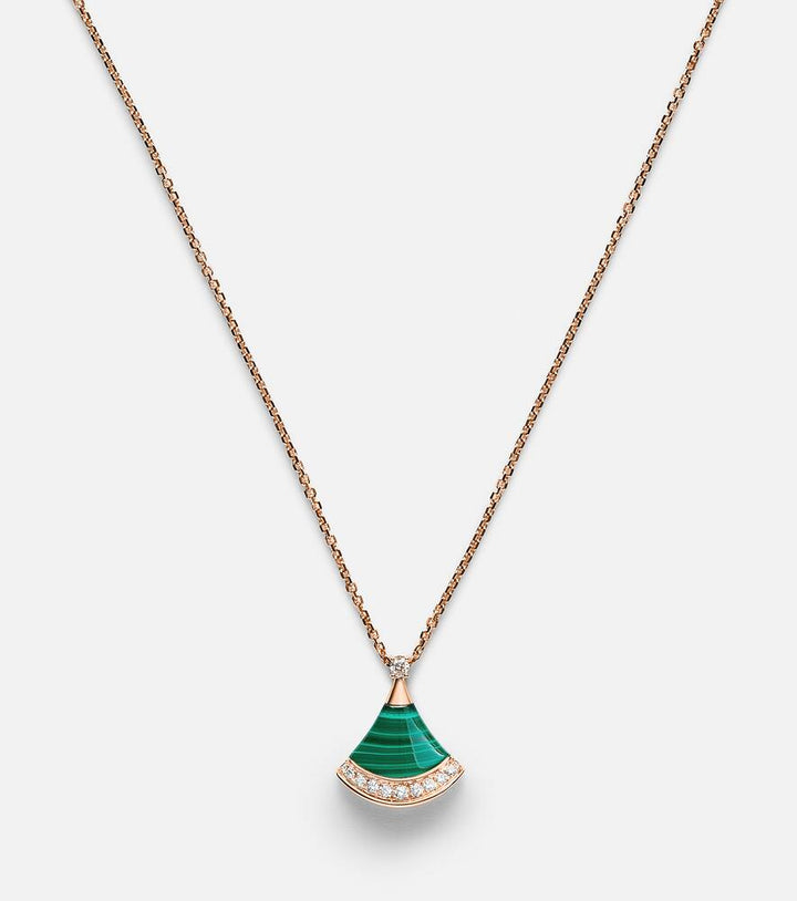 This Divas' Dream 18kt rose gold necklace with diamonds and malachite by Bvlgari is a majestic piece that embodies the essence of pure luxury. The necklace's delicate fan-shaped design is expertly crafted from 18kt rose gold and is beautifully adorned with a brilliant diamond (0.03ctw) and a single malachite stone (0.3ct). The piece feels both powerful and refined, a true statement of uncompromising quality and a celebration of life's most beautiful moments. This necklace is an accessory that symbolizes enduring elegance and a confident approach to style.