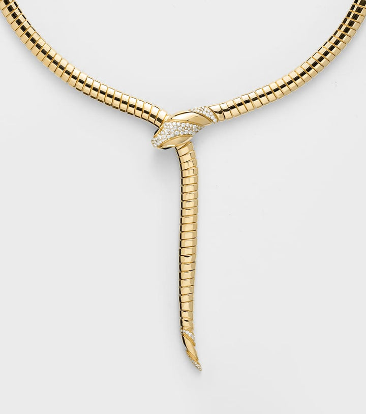This Serpenti Tubogas 18kt gold necklace with diamonds and onyx by Bvlgari is a majestic piece that embodies the essence of pure luxury. The necklace's elegant and fluid design is expertly crafted from 18kt yellow gold, and it is beautifully adorned with a magnificent collection of 111 brilliant diamonds (0.46ct) and a striking onyx stone (0.09ct). The piece feels both powerful and refined, a true statement of uncompromising quality and a celebration of life's most beautiful moments. This necklace is an accessory that symbolizes enduring elegance and a confident approach to style.