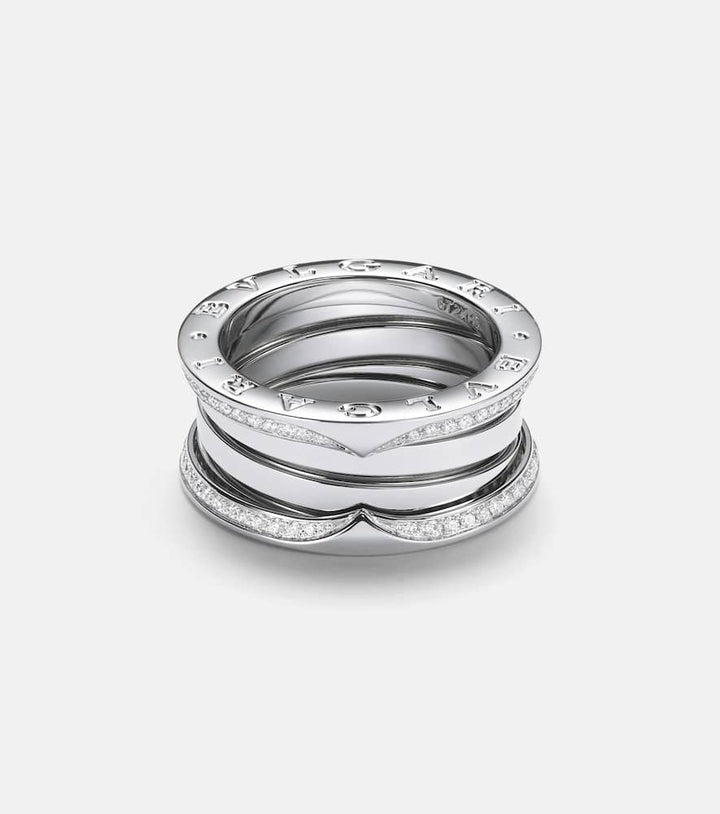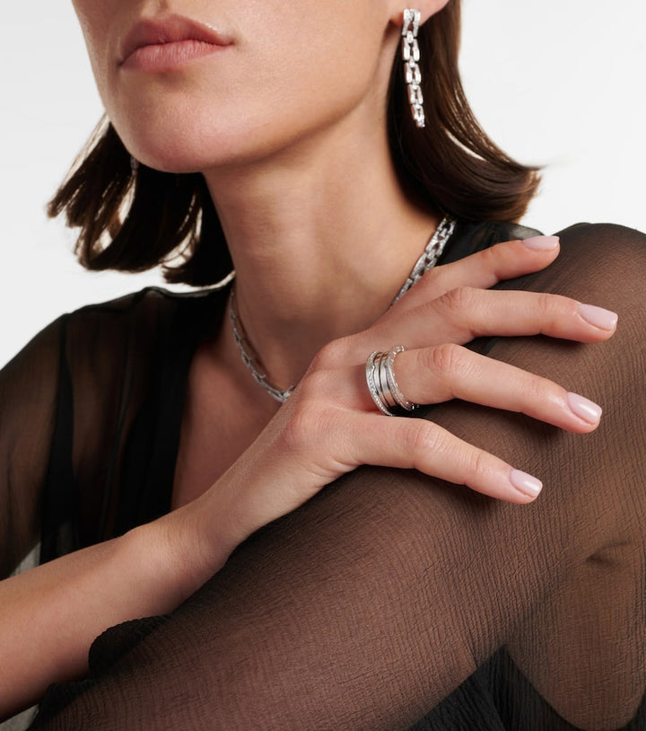 This B.zero1 18kt white gold ring with diamonds by Bvlgari is a bold and iconic accessory that embodies the brand's signature elegance. The ring's sculptural, fluid design is expertly crafted from white gold and adorned with a brilliant pavé of diamonds (0.51ct). The piece feels both powerful and luxurious, a true statement of refined taste and a celebration of uncompromising quality. This ring is a versatile accessory that can be worn for both everyday moments and special occasions, symbolizing a confident approach to style and a love for modern architectural design.